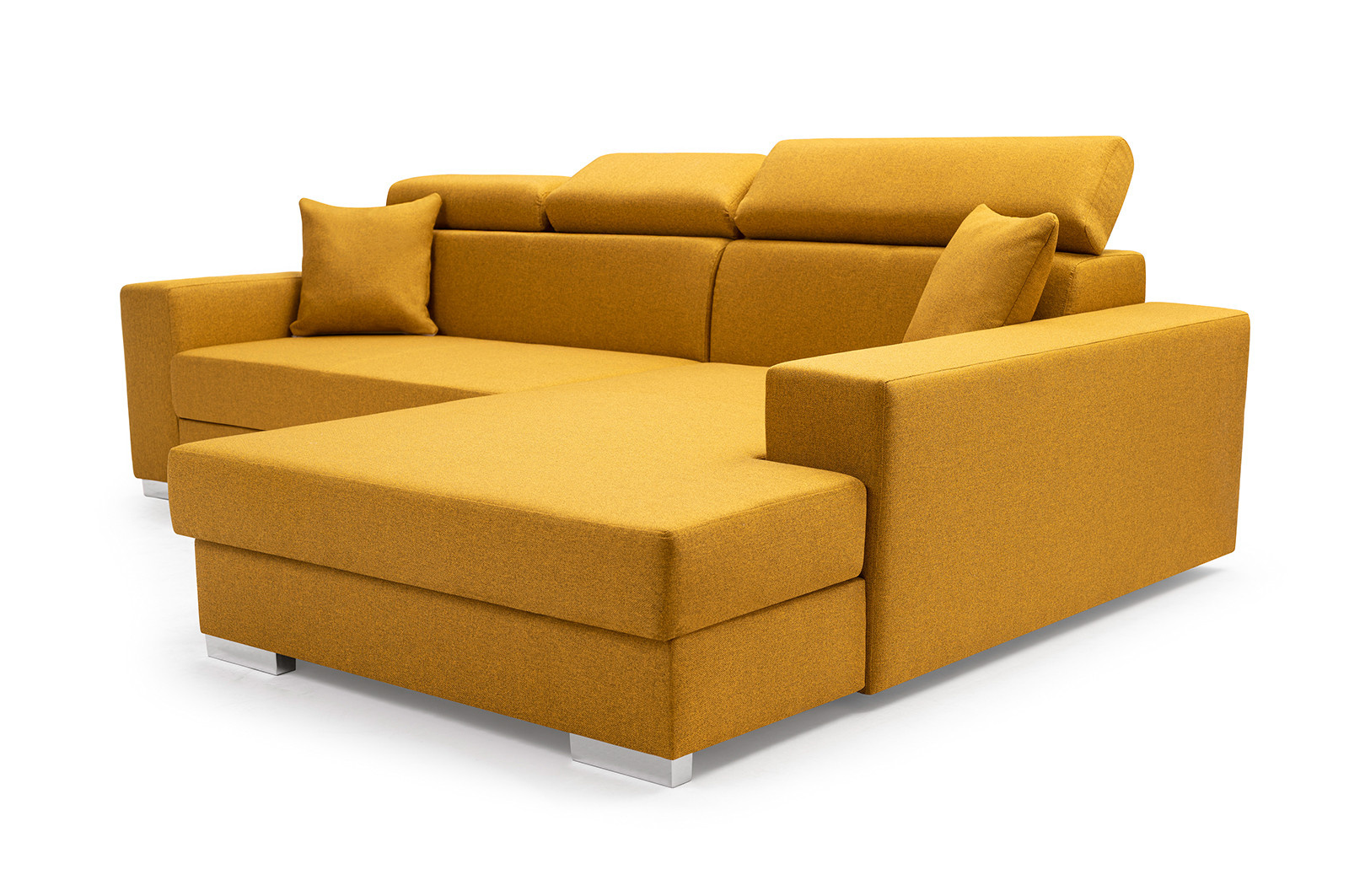 Sedací souprava MEXICO má moderní design, který se skvěle hodí do prostoru minimalistického nebo skandinávského obývacího pokoje. Stylová rohová sedací souprava je rozkládací kus nábytku, který je k dispozici v pravém nebo levém provedení. Rohová sedací souprava MEXICO ve tvaru písmene L má prostornou nádobu na lůžkoviny a je vybavena také funkcí spaní, takže ji lze rozložit. Rohová pohovka pro tři osoby je umístěna na dřevěném rámu a chromovaných nožkách, díky čemuž bude nejen stabilním a odolným kusem nábytku, ale také mimořádně estetickým a originálním. Nábytek je vyplněn vlnitými pružinami a čalounickou pěnou, tedy materiály, které se postarají o správnou pružnost - díky nim se na rohové pohovce ani přes neustálé používání neobjeví nevzhledné otlaky. Rohová sedací souprava MEXICO s bočnicemi je kus nábytku, který může být potažen látkou, koženkou .