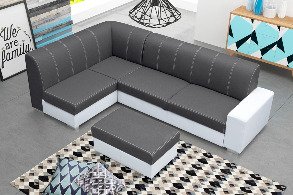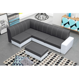 Elegantní rohová sedací souprava s taburetem se bude skvěle vyjímat v moderně zařízeném obývacím pokoji. Rohová pohovka s jednou stranou je k dispozici ve tvaru L, takže je možné zvolit pravostrannou nebo levostrannou verzi. Nábytek je umístěn na dřevěném rámu, který zajišťuje dostatečnou odolnost, pevnost a stabilitu konstrukce. Originální design nábytku doplňují chromované nohy. Barevné schéma lze vybrat z dostupných barevných vzorků. Rohová sedací souprava je vybavena prostorným kontejnerem na lůžkoviny a funkcí spaní, díky níž lze rohovou sedací soupravu rozložit. Rohová pohovka pro více osob je volně stojící kus nábytku - díky čalouněným zádům ji lze libovolně umístit do centrální části obývacího pokoje. Výplň rohové sedací soupravy tvoří vlnitá pružina a čalounická pěna; použité materiály zajišťují správnou pružnost, takže na rohové sedací soupravě nejsou vidět nevzhledné promáčkliny. Stylová rohová pohovka s ozdobným prošíváním na mírně tvarovaném opěradle zaručí nejen pohodlí při odpočinku, ale bude také ozdobou moderně zařízeného obývacího pokoje.