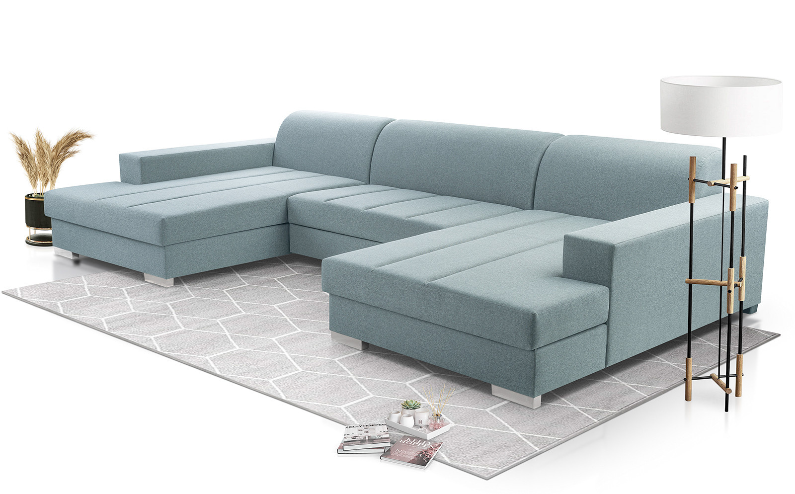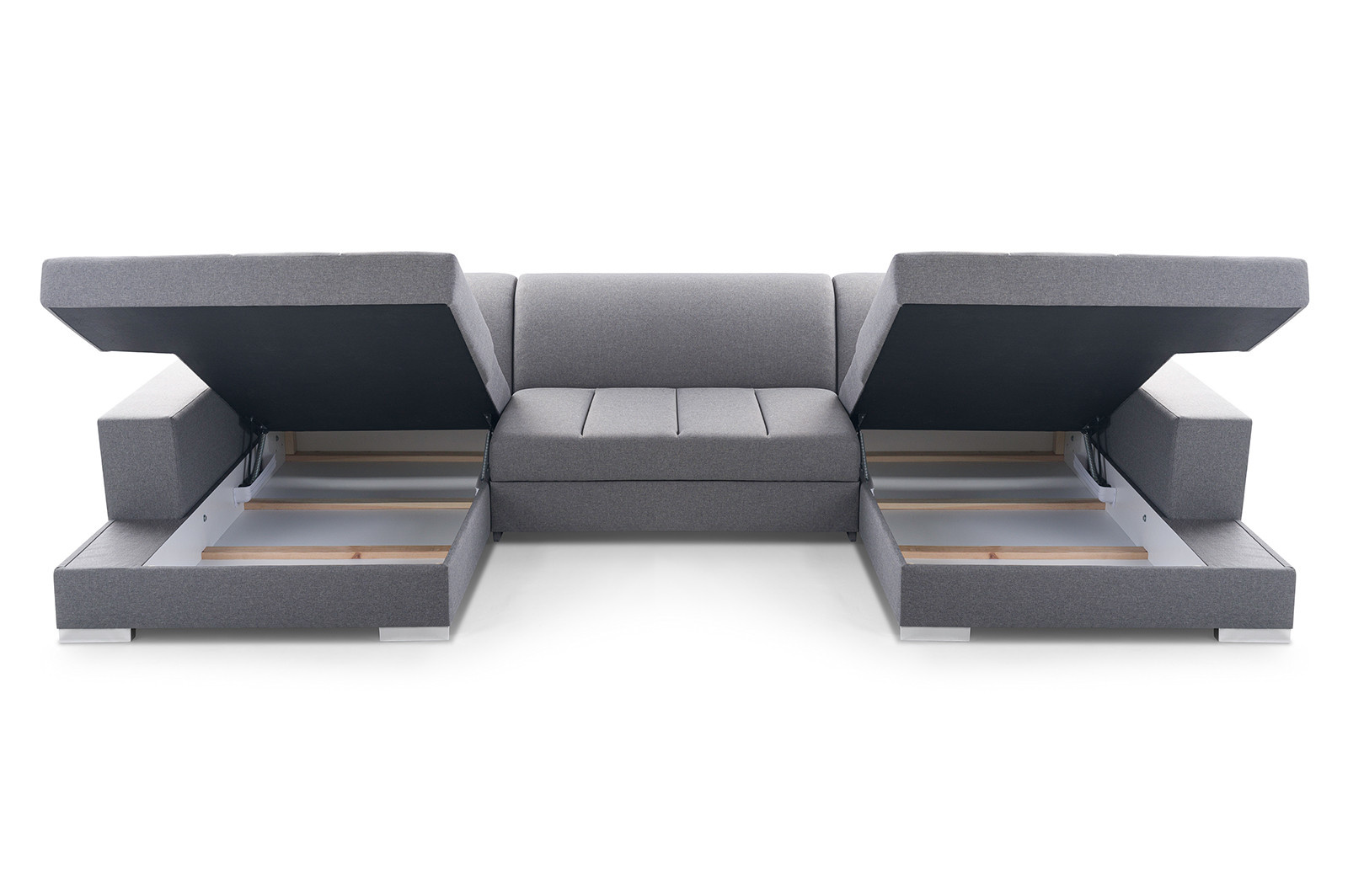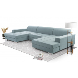 Rohová sedací souprava Mistral U je elegantní sedací souprava ve tvaru písmene U, která má poměrně univerzální tvar, takže ji lze bez větších problémů umístit ke stěně i doprostřed místnosti - jedná se o volně stojící kus nábytku s čalouněným opěradlem. Rozkládací rohová sedačka s rozkládáním, je vybavena 2 úložnými prostory a má funkci spaní. Stabilní a odolnou konstrukci tvoří dřevěný rám a prostor pod čalouněním je zakončen vlnitou pružinou a čalounickou pěnou, díky níž na nábytku nezůstanou nevzhledné otlaky ani deformace. Akcentem, který nábytku dodává originalitu a lehkost, jsou ozdobné stříbrné nohy. Rohová pohovka pro více osob je kus nábytku plně čalouněný kvalitní látkou, jejíž barevné provedení si můžete vybrat. Rohová sedací souprava AKITA U s bočnicemi v základním provedení . Sedací soupravu lze umístit doprostřed místnosti.
