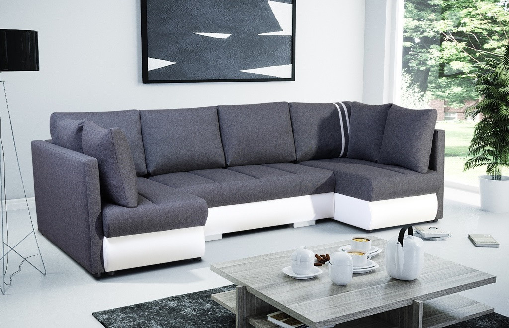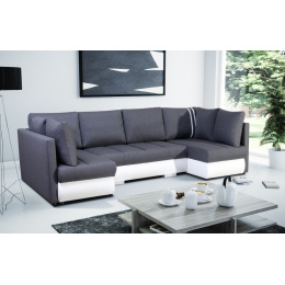 Rohová sedací souprava R-CITY U je elegantní sedací souprava ve tvaru písmene U, která má poměrně univerzální tvar, takže ji lze bez větších problémů umístit ke stěně i doprostřed místnosti - jedná se o volně stojící kus nábytku s čalouněným opěradlem. Rozkládací rohová sedačka s automatem MOS, který podporuje proces rozkládání, je vybavena třemi nádobami na lůžkoviny a má funkci spaní. Stabilní a odolnou konstrukci tvoří dřevěný rám a prostor pod čalouněním je zakončen vlnitou pružinou a čalounickou pěnou, díky níž na nábytku nezůstanou nevzhledné otlaky ani deformace. Akcentem, který nábytku dodává originalitu a lehkost, jsou ozdobné chromované nohy. Rohová pohovka pro více osob je kus nábytku plně čalouněný kvalitní látkou, jejíž barevné provedení si můžete vybrat. Rohová sedací souprava R-CITY U s bočnicemi v základním provedení je doplněna vložkami z ekokůže . Součástí dodávky jsou polštáře, které nábytku dodávají estetický nádech.