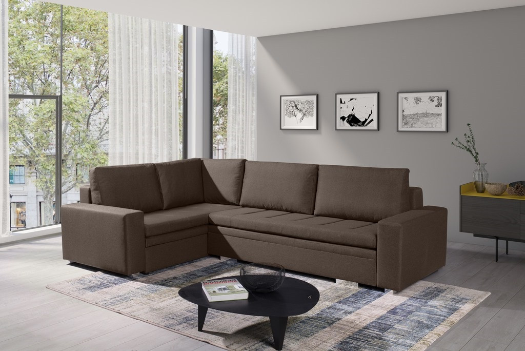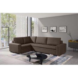 Moderní rohová sedací souprava TIA je určena pro více osob a je vybavena až dvěma kontejnery na lůžkoviny, do kterých můžete bez větších problémů uložit polštáře, přikrývky a peřiny. Rohová sedací souprava ve tvaru písmene L je k dispozici v pravém nebo levém provedení. Stylová rohová sedací souprava s funkcí spaní je navíc vybavena automatickým rozkladem, díky níž je možné nábytek rychle a efektivně rozložit. Rohová sedací souprava pro více osob s bočnicemi je vyplněna vlnitou pružinou na spací ploše, sedáku a opěráku a také čalounickou pěnou T-30. Volně stojící rohová sedací souprava je umístěna na ozdobných chromovaných nožkách, které podtrhují modernistické uspořádání nábytku. Odolný a stabilní kus nábytku s dřevěným rámem má čalouněná záda, díky nimž jej lze umístit nejen ke stěně, ale i do centrální části místnosti. Rozkládací rohovou pohovku TIA do obývacího pokoje lze čalounit různými látkami.