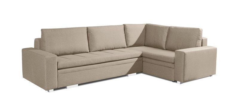 Moderní rohová sedací souprava TIA je určena pro více osob a je vybavena až dvěma kontejnery na lůžkoviny, do kterých můžete bez větších problémů uložit polštáře, přikrývky a peřiny. Rohová sedací souprava ve tvaru písmene L je k dispozici v pravém nebo levém provedení. Stylová rohová sedací souprava s funkcí spaní je navíc vybavena automatickým rozkladem, díky níž je možné nábytek rychle a efektivně rozložit. Rohová sedací souprava pro více osob s bočnicemi je vyplněna vlnitou pružinou na spací ploše, sedáku a opěráku a také čalounickou pěnou T-30. Volně stojící rohová sedací souprava je umístěna na ozdobných chromovaných nožkách, které podtrhují modernistické uspořádání nábytku. Odolný a stabilní kus nábytku s dřevěným rámem má čalouněná záda, díky nimž jej lze umístit nejen ke stěně, ale i do centrální části místnosti. Rozkládací rohovou pohovku TIA do obývacího pokoje lze čalounit různými látkami.