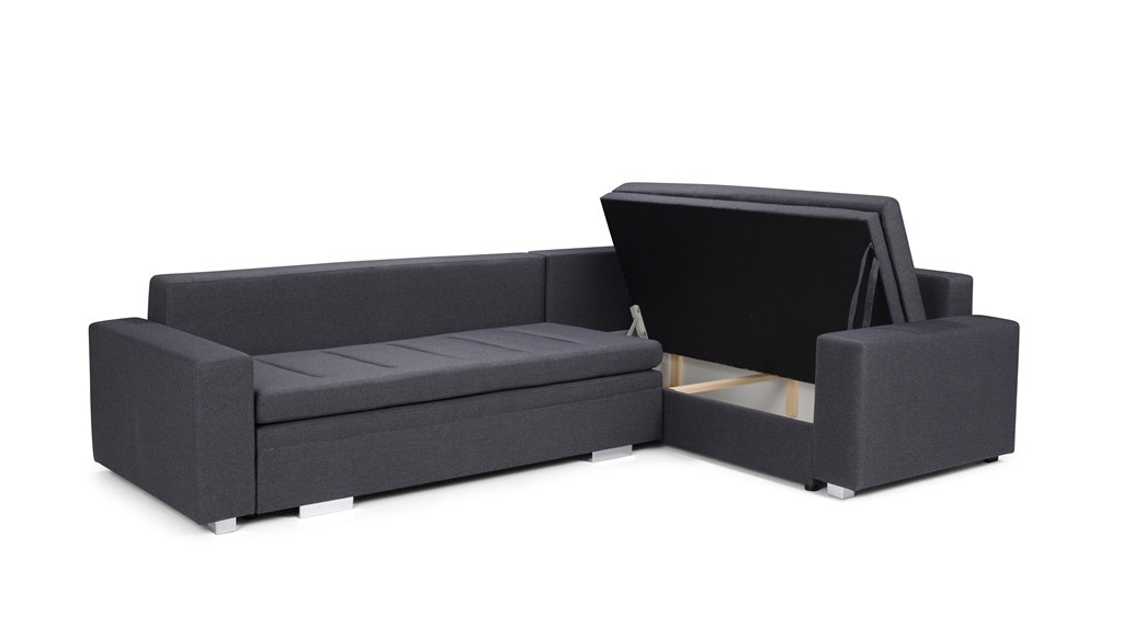 Moderní rohová sedací souprava TIA je určena pro více osob a je vybavena až dvěma kontejnery na lůžkoviny, do kterých můžete bez větších problémů uložit polštáře, přikrývky a peřiny. Rohová sedací souprava ve tvaru písmene L je k dispozici v pravém nebo levém provedení. Stylová rohová sedací souprava s funkcí spaní je navíc vybavena automatickým rozkladem, díky níž je možné nábytek rychle a efektivně rozložit. Rohová sedací souprava pro více osob s bočnicemi je vyplněna vlnitou pružinou na spací ploše, sedáku a opěráku a také čalounickou pěnou T-30. Volně stojící rohová sedací souprava je umístěna na ozdobných chromovaných nožkách, které podtrhují modernistické uspořádání nábytku. Odolný a stabilní kus nábytku s dřevěným rámem má čalouněná záda, díky nimž jej lze umístit nejen ke stěně, ale i do centrální části místnosti. Rozkládací rohovou pohovku TIA do obývacího pokoje lze čalounit různými látkami.