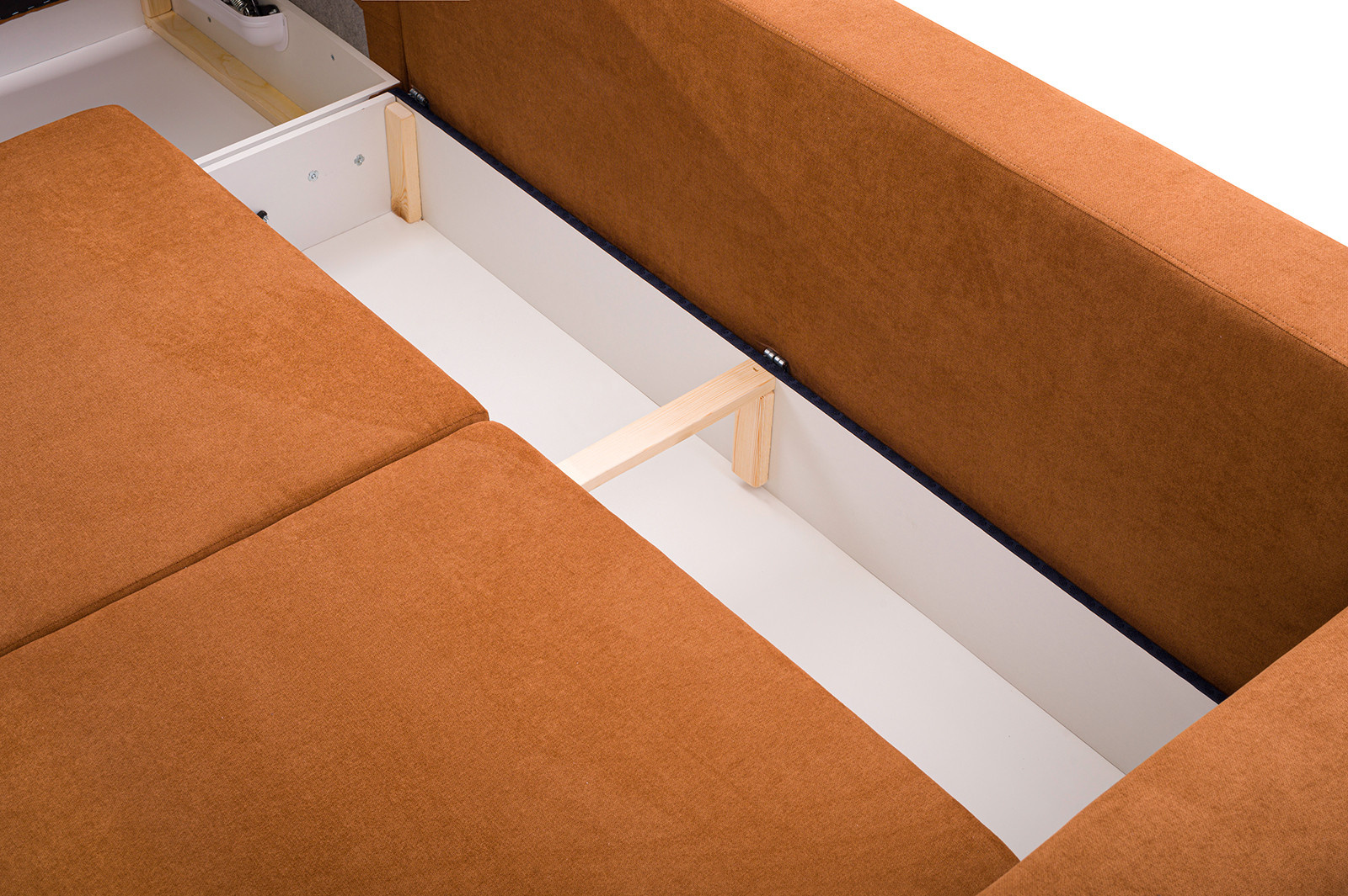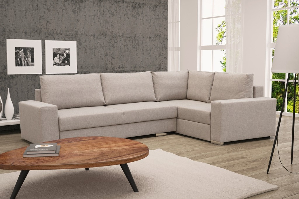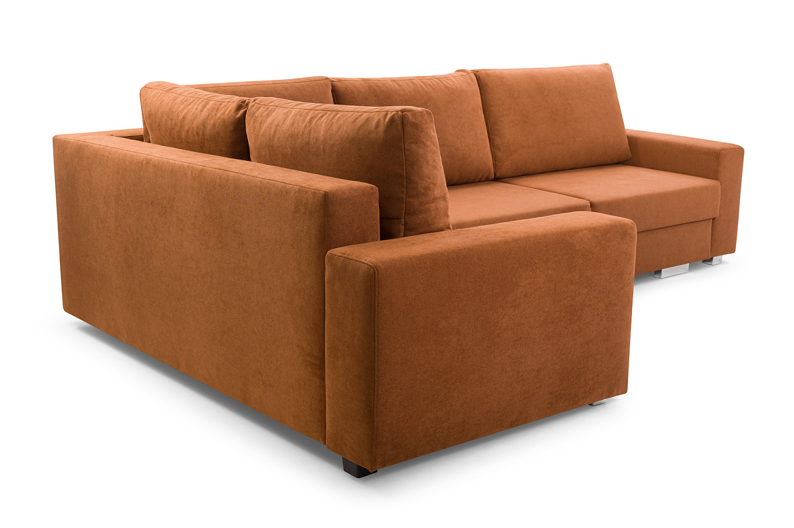 Rozkládací rohová pohovka TORNADO je prostorný volně stojící kus nábytku, který je k dispozici v pravém nebo levém provedení. Představená rohová sedací souprava s bočnicemi ve tvaru písmene L je vybavena dekorativními polštáři, které lze umístit na opěradlo nábytku. Moderní rohová sedací souprava do obývacího pokoje je nábytek pro více osob, který zaujme estetickým designem a doplňkovými chromovanými nožkami. Rohová pohovka je praktická při každodenním používání a zaručuje pohodlí a komfort i při několikahodinovém sezení nebo odpoledním spánku. Rohová pohovka je vybavena automatickým rozkládáním, díky němuž ji lze efektivně přeměnit na lůžko. Nábytek s dřevěným rámem má dva úložné prostory na lůžkoviny, do kterých můžete snadno uložit peřiny, polštáře a přikrývky, ale i předměty denní potřeby, které se nevejdou do skříně. Model TORNADO je rohová sedací souprava, která je vyplněna vlnitými pružinami a čalounickou pěnou - ani její časté používání neovlivní pružnost sedáku nebo opěráku. Rohová sedací souprava s funkcí spaní je čalouněná látkou, jejíž barvy si můžete vybrat z dostupných barevných vzorků.