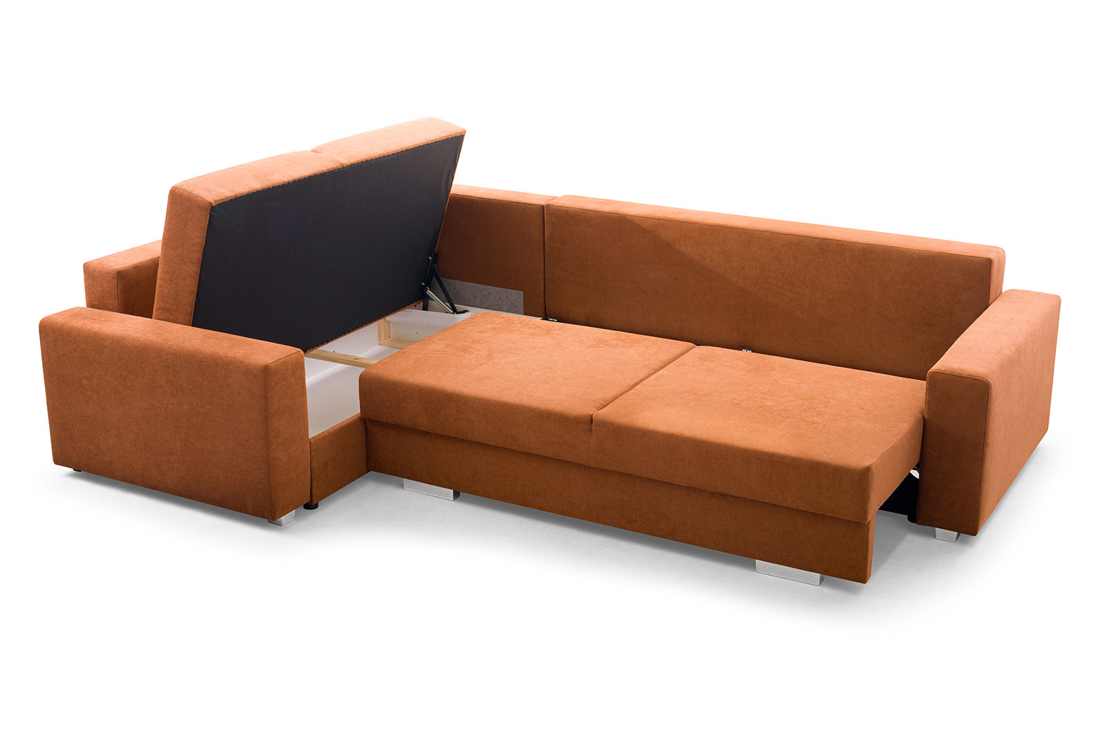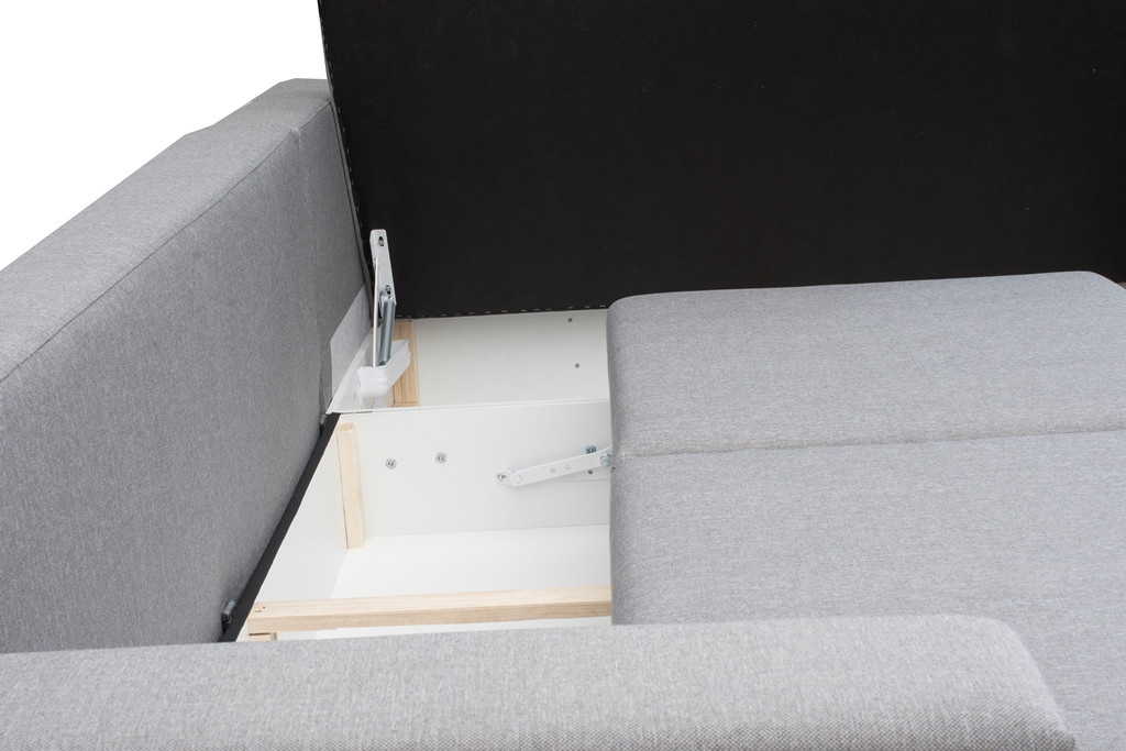 Rozkládací rohová pohovka TORNADO je prostorný volně stojící kus nábytku, který je k dispozici v pravém nebo levém provedení. Představená rohová sedací souprava s bočnicemi ve tvaru písmene L je vybavena dekorativními polštáři, které lze umístit na opěradlo nábytku. Moderní rohová sedací souprava do obývacího pokoje je nábytek pro více osob, který zaujme estetickým designem a doplňkovými chromovanými nožkami. Rohová pohovka je praktická při každodenním používání a zaručuje pohodlí a komfort i při několikahodinovém sezení nebo odpoledním spánku. Rohová pohovka je vybavena automatickým rozkládáním, díky němuž ji lze efektivně přeměnit na lůžko. Nábytek s dřevěným rámem má dva úložné prostory na lůžkoviny, do kterých můžete snadno uložit peřiny, polštáře a přikrývky, ale i předměty denní potřeby, které se nevejdou do skříně. Model TORNADO je rohová sedací souprava, která je vyplněna vlnitými pružinami a čalounickou pěnou - ani její časté používání neovlivní pružnost sedáku nebo opěráku. Rohová sedací souprava s funkcí spaní je čalouněná látkou, jejíž barvy si můžete vybrat z dostupných barevných vzorků.
