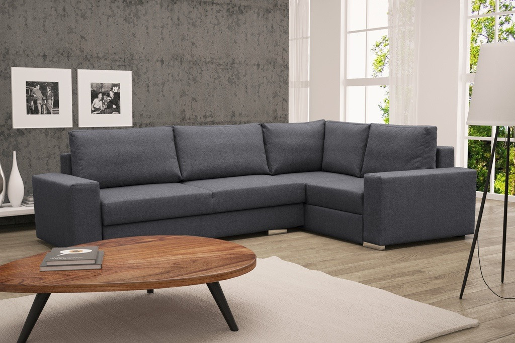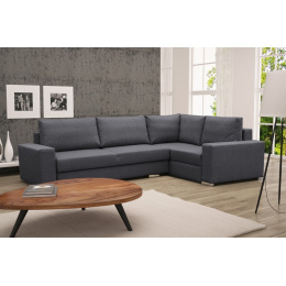 Rozkládací rohová pohovka TORNADO je prostorný volně stojící kus nábytku, který je k dispozici v pravém nebo levém provedení. Představená rohová sedací souprava s bočnicemi ve tvaru písmene L je vybavena dekorativními polštáři, které lze umístit na opěradlo nábytku. Moderní rohová sedací souprava do obývacího pokoje je nábytek pro více osob, který zaujme estetickým designem a doplňkovými chromovanými nožkami. Rohová pohovka je praktická při každodenním používání a zaručuje pohodlí a komfort i při několikahodinovém sezení nebo odpoledním spánku. Rohová pohovka je vybavena automatickým rozkládáním, díky němuž ji lze efektivně přeměnit na lůžko. Nábytek s dřevěným rámem má dva úložné prostory na lůžkoviny, do kterých můžete snadno uložit peřiny, polštáře a přikrývky, ale i předměty denní potřeby, které se nevejdou do skříně. Model TORNADO je rohová sedací souprava, která je vyplněna vlnitými pružinami a čalounickou pěnou - ani její časté používání neovlivní pružnost sedáku nebo opěráku. Rohová sedací souprava s funkcí spaní je čalouněná látkou, jejíž barvy si můžete vybrat z dostupných barevných vzorků.