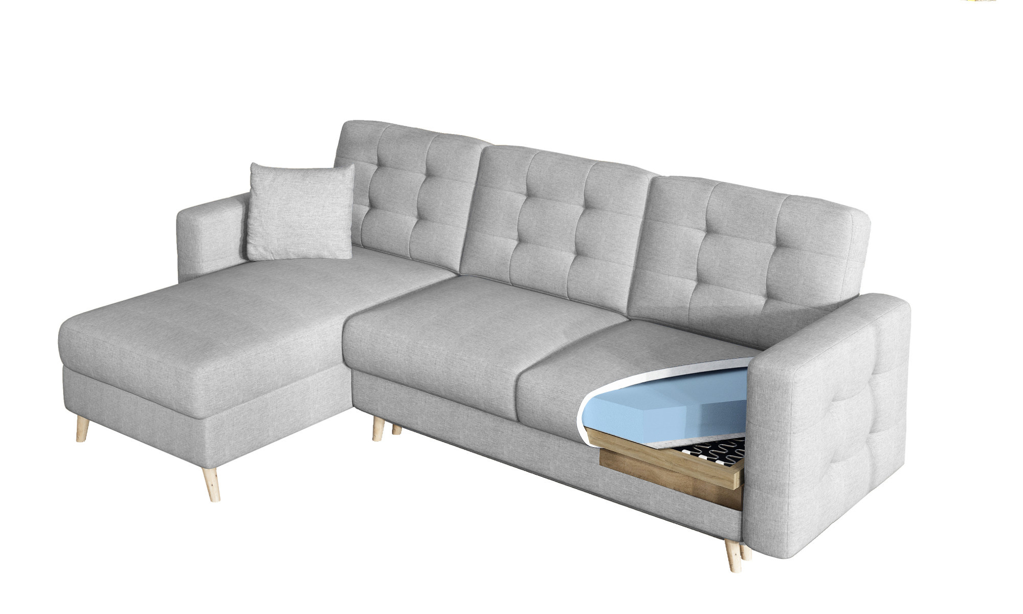 Rohová sedací souprava ASGARD L je UNIVERSÁLNÍ - stranu rohu si můžete měnit podle Vašeho přání. Sedací souprava je vyrobena z kvalitních materiálů. Konstrukce sedací soupravy je vyrobena z kombinace dřeva a lamina. Sedací část je vyrobena z polyuretanové pěny T3040 a pružin, opěrná část je vyrobena z polyuretanové pěny T2542. Sedací souprava má úložný prostor pro úschovu lůžkovin.