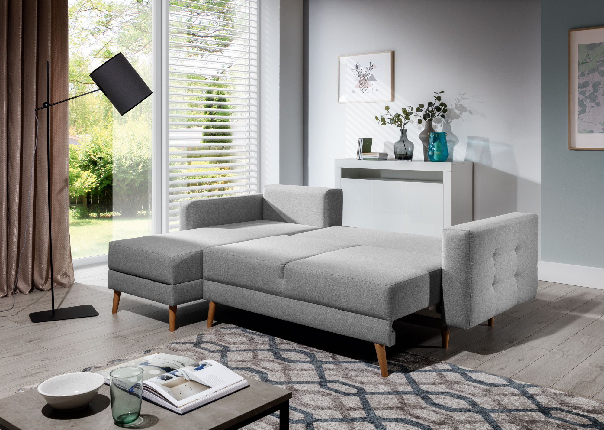 Sedací soupravu lze rozložit a vytvořit tak spací plochu o rozměrech 120x210 cm.