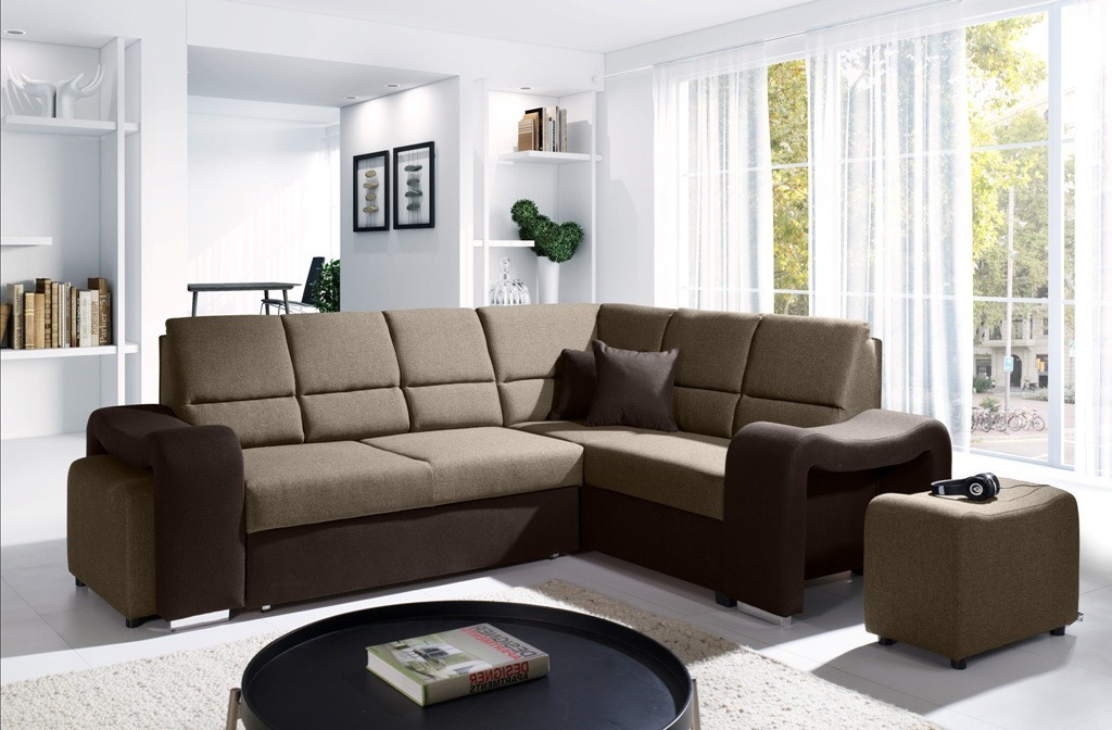 Rohová sedací souprava WAKIKI má stylový design, který zajistí pohodlí i při mnohahodinovém odpočinku s rodinou nebo přáteli. Tato moderní rohová pohovka ve tvaru písmene L je k dispozici v pravém i levém provedení. Představená rohová sedací souprava pro více osob s funkcí spaní umožňuje rozložit nábytek, což zajistí pohodlí a bezpečnost spánku. WAKIKI je k dispozici v široké škále barev, takže si každý může vytvořit model podle svého individuálního vkusu a preferencí. Moderní rohová pohovka do obývacího pokoje je doplněna dvěma taburety, které vytvářejí další sedací plochu a hodí se i jako podnožka. Do nábytku byly zabudovány speciální úložné prostory pro výše zmíněné taburety, do kterých je bude možné volně uložit, když se nebudou používat. Nábytek stojí na dřevěném rámu s chromovanými nohami, které mu dodávají moderní vzhled. Volně stojící rohová sedací souprava WAKIKI má také úložný prostor na lůžkoviny, do kterého lze bez větších problémů uložit přikrývky, polštáře nebo deky.