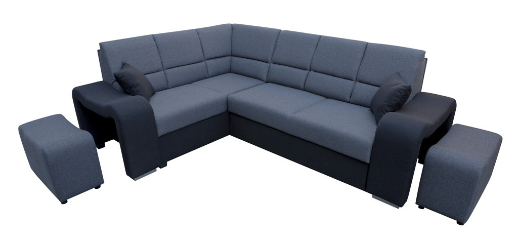 Rohová sedací souprava WAKIKI má stylový design, který zajistí pohodlí i při mnohahodinovém odpočinku s rodinou nebo přáteli. Tato moderní rohová pohovka ve tvaru písmene L je k dispozici v pravém i levém provedení. Představená rohová sedací souprava pro více osob s funkcí spaní umožňuje rozložit nábytek, což zajistí pohodlí a bezpečnost spánku. WAKIKI je k dispozici v široké škále barev, takže si každý může vytvořit model podle svého individuálního vkusu a preferencí. Moderní rohová pohovka do obývacího pokoje je doplněna dvěma taburety, které vytvářejí další sedací plochu a hodí se i jako podnožka. Do nábytku byly zabudovány speciální úložné prostory pro výše zmíněné taburety, do kterých je bude možné volně uložit, když se nebudou používat. Nábytek stojí na dřevěném rámu s chromovanými nohami, které mu dodávají moderní vzhled. Volně stojící rohová sedací souprava WAKIKI má také úložný prostor na lůžkoviny, do kterého lze bez větších problémů uložit přikrývky, polštáře nebo deky.