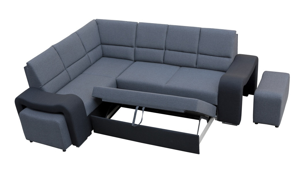 Rohová sedací souprava WAKIKI má stylový design, který zajistí pohodlí i při mnohahodinovém odpočinku s rodinou nebo přáteli. Tato moderní rohová pohovka ve tvaru písmene L je k dispozici v pravém i levém provedení. Představená rohová sedací souprava pro více osob s funkcí spaní umožňuje rozložit nábytek, což zajistí pohodlí a bezpečnost spánku. WAKIKI je k dispozici v široké škále barev, takže si každý může vytvořit model podle svého individuálního vkusu a preferencí. Moderní rohová pohovka do obývacího pokoje je doplněna dvěma taburety, které vytvářejí další sedací plochu a hodí se i jako podnožka. Do nábytku byly zabudovány speciální úložné prostory pro výše zmíněné taburety, do kterých je bude možné volně uložit, když se nebudou používat. Nábytek stojí na dřevěném rámu s chromovanými nohami, které mu dodávají moderní vzhled. Volně stojící rohová sedací souprava WAKIKI má také úložný prostor na lůžkoviny, do kterého lze bez větších problémů uložit přikrývky, polštáře nebo deky.