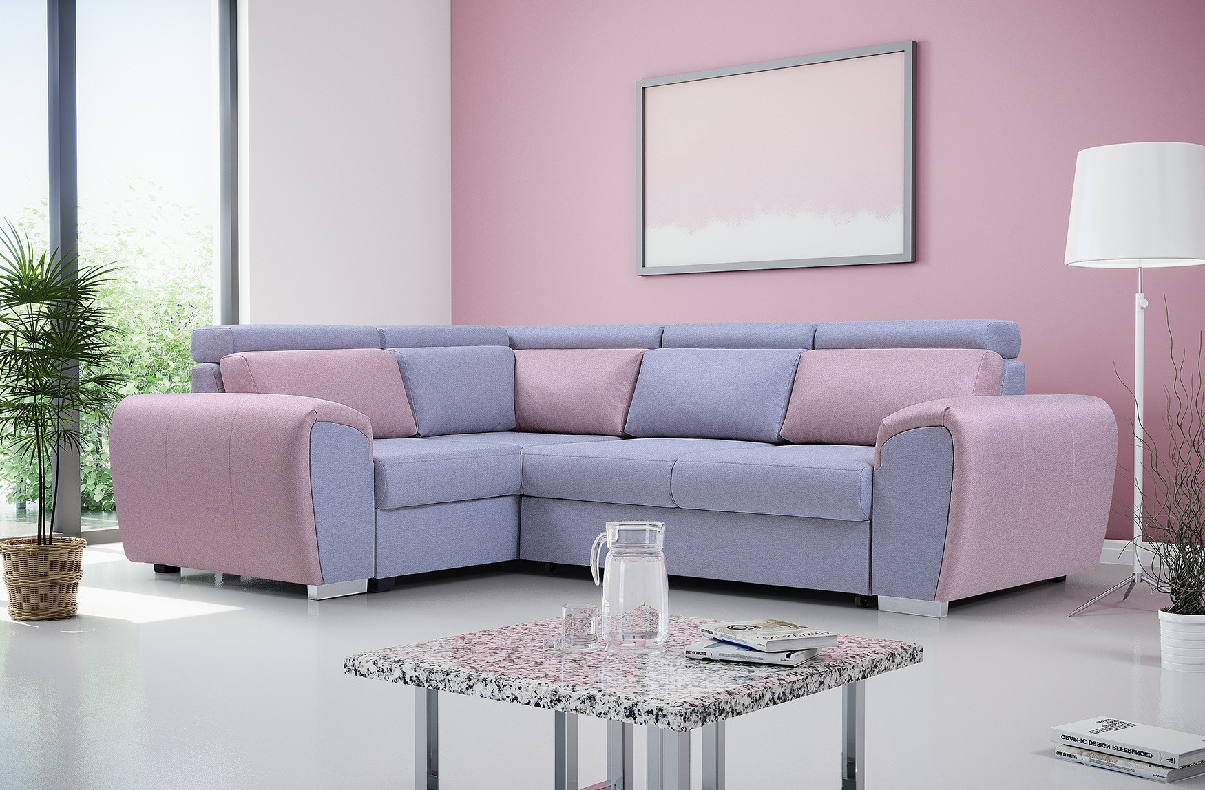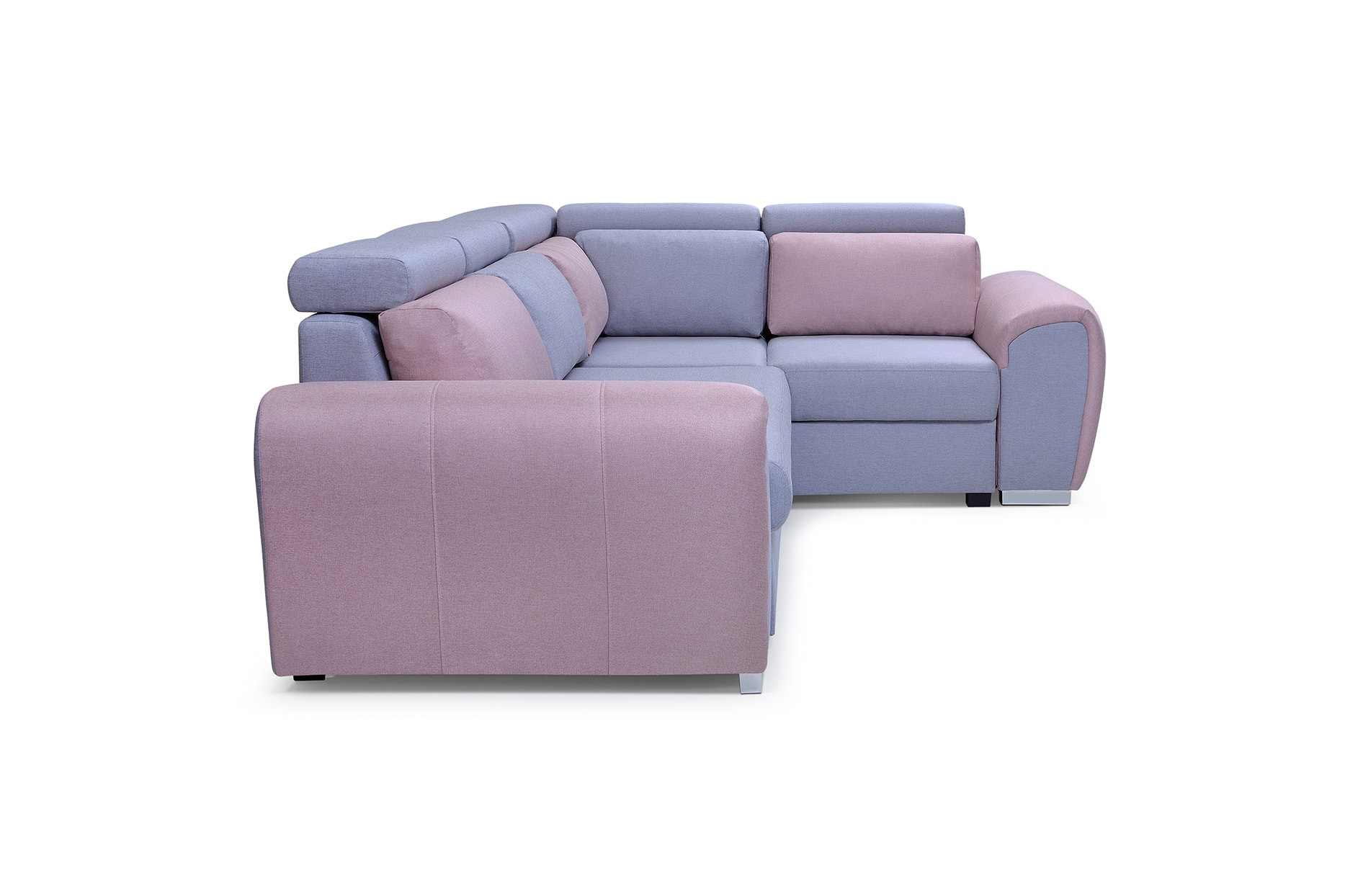 Dvoubarevná rohová sedací souprava WYZ je vysoce estetický design s jemně zaoblenými tvary, který se bude skvěle hodit do prostoru obývacího pokoje nebo moderně zařízeného obývacího pokoje. Rozkládací rohová sedací souprava s bočnicemi stojí na chromových nožkách, které nejenže dodávají nábytku stylový charakter, ale také zajišťují odpovídající stabilitu a odolnost. Rohová sedací souprava WYZ ve tvaru písmene L je k dispozici v pravém nebo levém provedení. Rohová sedací souprava s bočnicemi je vybavena nádobou na lůžkoviny, funkcí spaní a automatickým rozkládáním typu delfín. Rohová pohovka je čalouněná látkou a je k dispozici v široké škále barev, aby vyhovovala individuálním preferencím každého z vás. Představený model WYZ je vybaven nastavitelnými opěrkami hlavy a dekorativními polštáři, které zajistí pohodlí i při několikahodinovém sezení s knihou v ruce nebo při sledování televize. Dřevěný rám je vyplněn vlnitými pružinami a čalounickou pěnou, které se starají o zachování zvýšené pružnosti, takže na nábytku nevznikají nevzhledné deformace. Moderní rohová sedací souprava se vyrábí na objednávku, takže je možné zvolit barvu vložek a celkové barevné provedení.