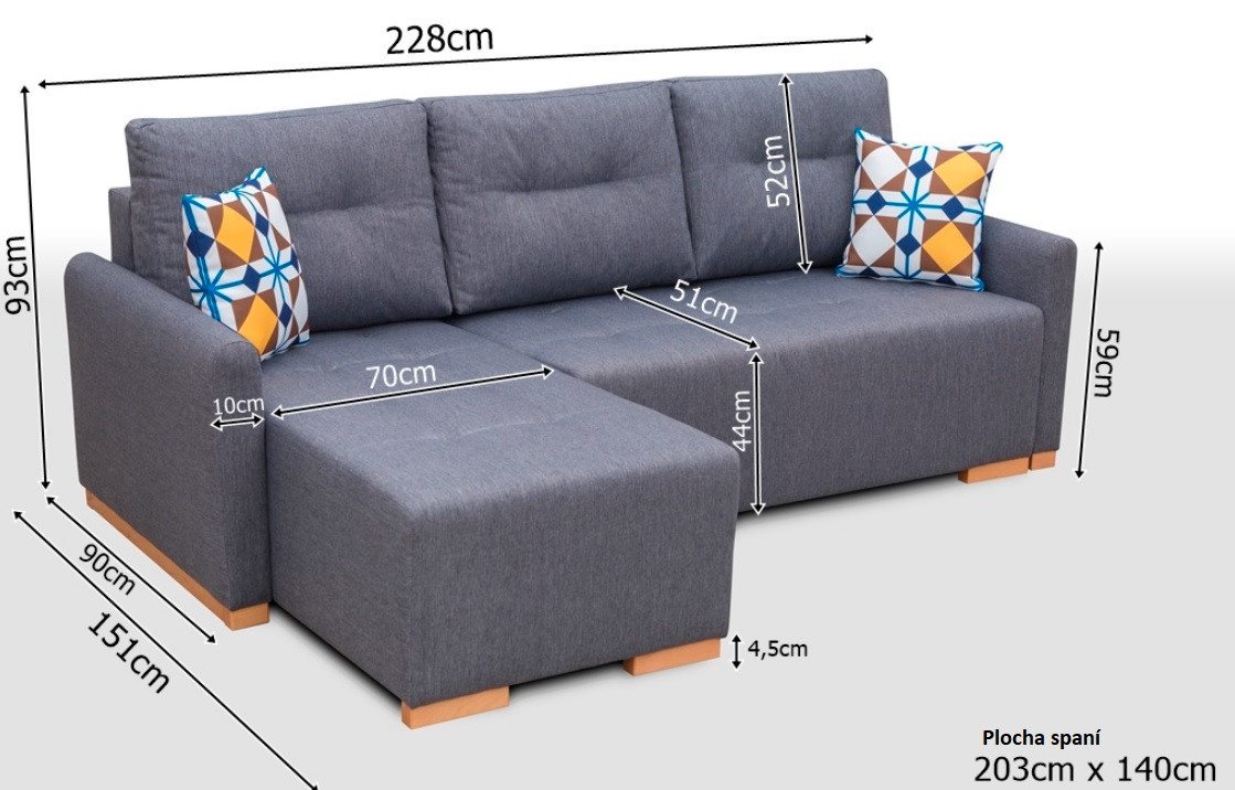 Rohová sedací souprava X1 je elegantní konstrukce, která stojí na dřevěných nohách, jež podtrhují moderní charakter korpusu. Rohovou sedací soupravu s bočnicemi ve tvaru L lze různou látkou. Představený rohový model má kromě dřevěných nohou také dřevěný rám, který zaručuje dostatečnou odolnost a stabilitu. Rozkládací rohová pohovka X1 je k dispozici v pravém nebo levém provedení podle vašeho výběru. V rohu je k dispozici úložný prostor na lůžkoviny, do kterého lze bez větších problémů uložit přikrývky, polštáře a peřiny. Rohová pohovka X1 s funkcí spaní zajistí svým uživatelům bezpečný a pohodlný spánek. Barevné provedení nábytku si můžete vybrat z široké škály barev dostupných ve vzorníku. Sedák je spolu s opěradlem v podobě tří prošívaných polštářů vyplněn vlnitými pružinami a čalounickou pěnou, které se starají o zachování odpovídající pružnosti nábytku, jenž tak rychle nepodléhá opotřebení.