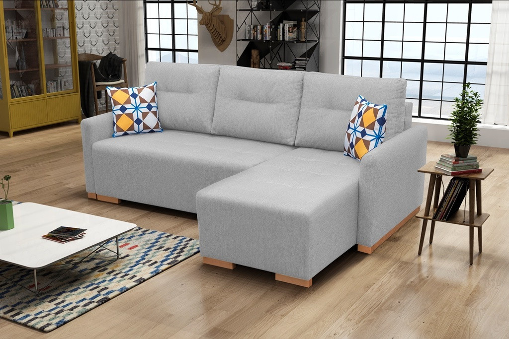 Rohová sedací souprava X1 je elegantní konstrukce, která stojí na dřevěných nohách, jež podtrhují moderní charakter korpusu. Rohovou sedací soupravu s bočnicemi ve tvaru L lze různou látkou. Představený rohový model má kromě dřevěných nohou také dřevěný rám, který zaručuje dostatečnou odolnost a stabilitu. Rozkládací rohová pohovka X1 je k dispozici v pravém nebo levém provedení podle vašeho výběru. V rohu je k dispozici úložný prostor na lůžkoviny, do kterého lze bez větších problémů uložit přikrývky, polštáře a peřiny. Rohová pohovka X1 s funkcí spaní zajistí svým uživatelům bezpečný a pohodlný spánek. Barevné provedení nábytku si můžete vybrat z široké škály barev dostupných ve vzorníku. Sedák je spolu s opěradlem v podobě tří prošívaných polštářů vyplněn vlnitými pružinami a čalounickou pěnou, které se starají o zachování odpovídající pružnosti nábytku, jenž tak rychle nepodléhá opotřebení.