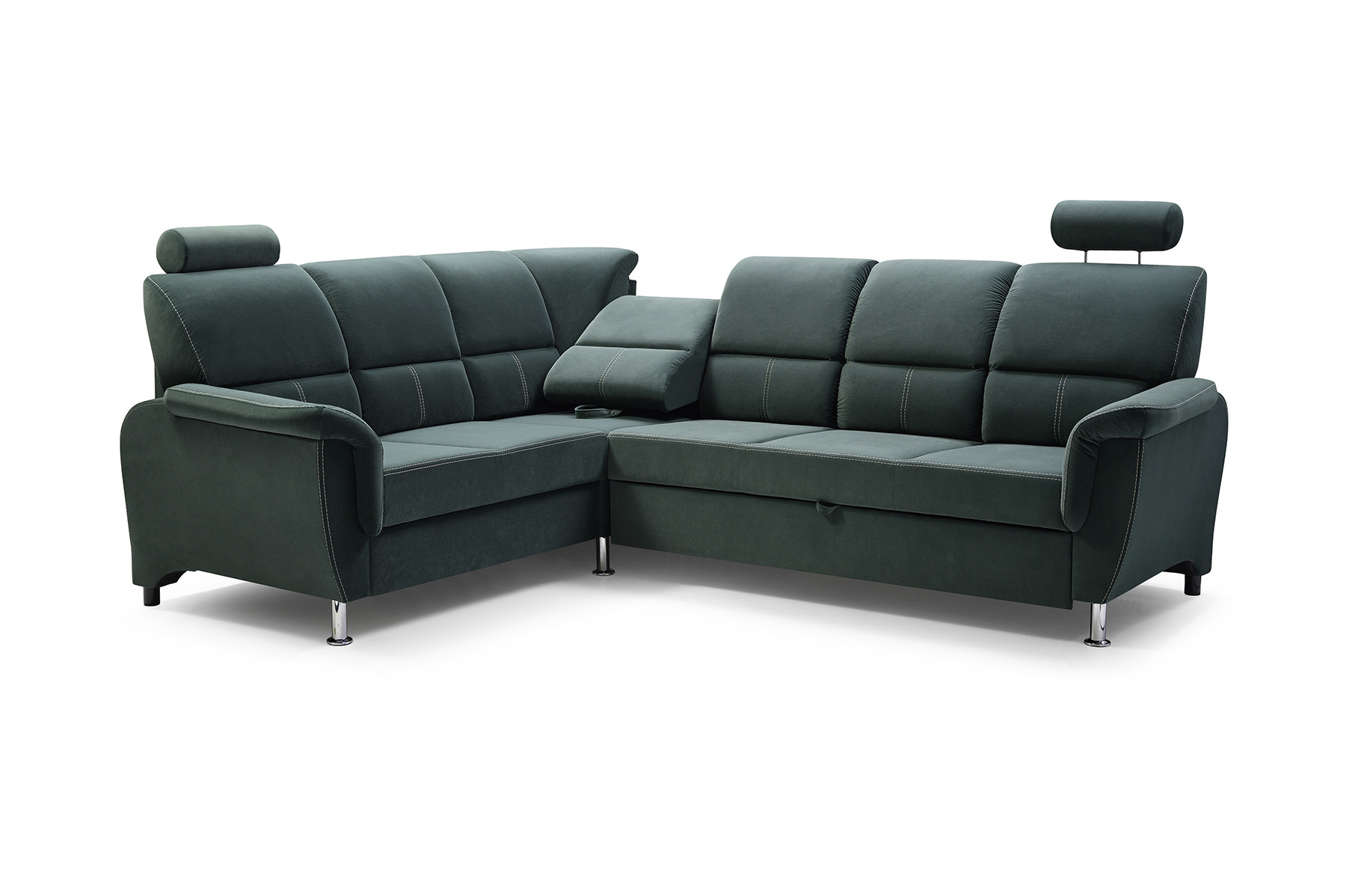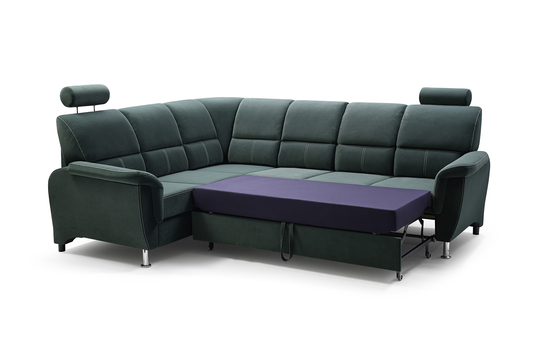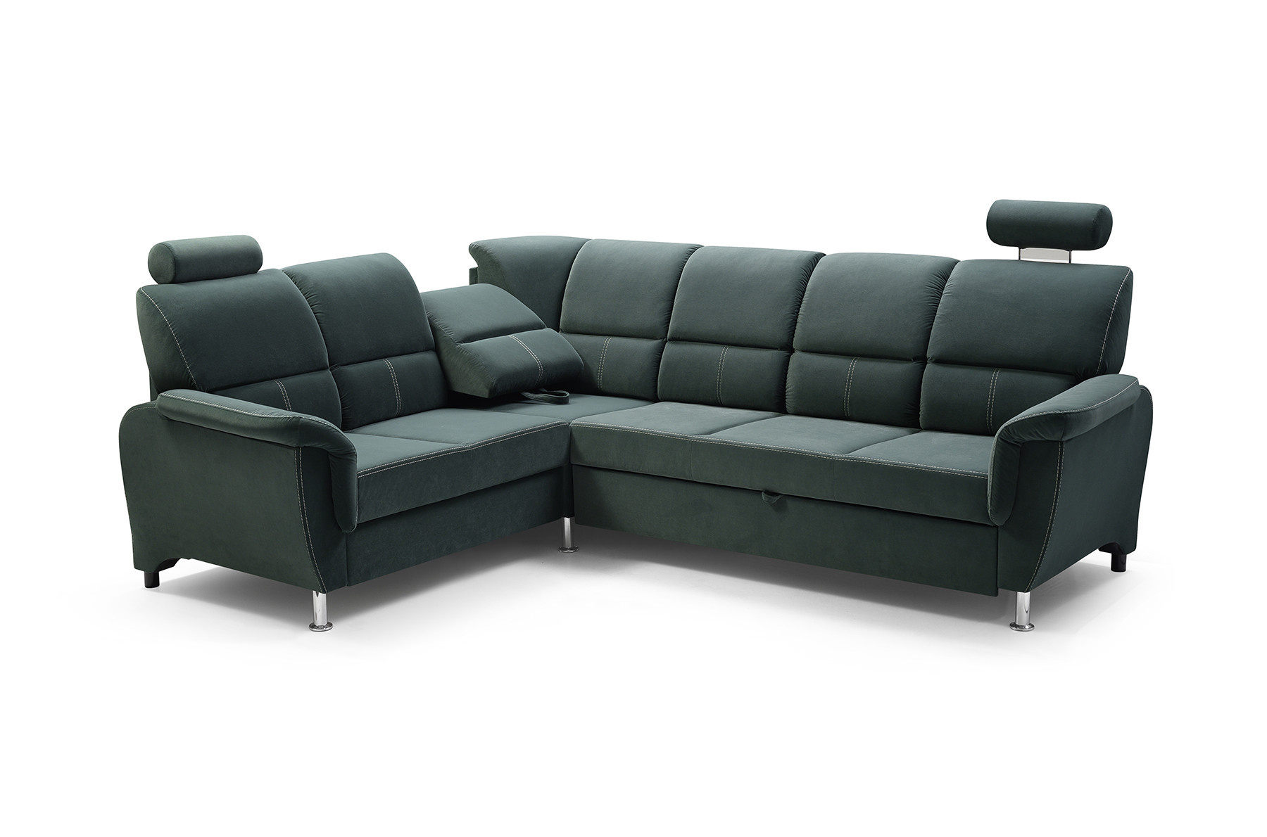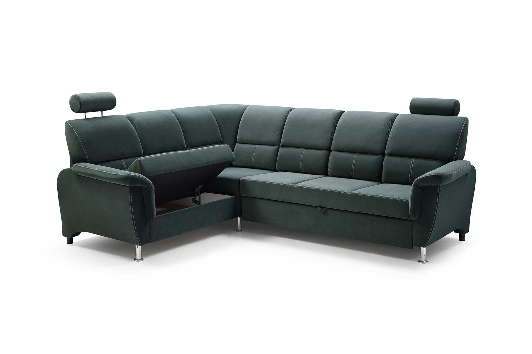 Rozkládací rohová pohovka DIANA s funkcí TV je vysoce estetický kus nábytku, který najde své dokonalé místo v obývacím pokoji pro volný čas. Úhledná rohová sedací souprava se dvěma opěrkami hlavy zaujme na první pohled dekorativním prošíváním, které dodává nábytku mimořádně luxusní charakter. Rohová sedací souprava s bočnicemi je k dispozici v pravostranném nebo levostranném provedení podle vašeho výběru, takže ji každý může přizpůsobit uspořádanému interiéru. Rohová pohovka pro více osob s funkcí spaní je vybavena výsuvným opěradlem, na které si můžete volně lehnout a sledovat film nebo televizní seriál v pololeže. Model DIANA má navíc nádobu na lůžkoviny a funkci spaní, takže můžete snadno a bezpečně ubytovat přátele a pozvané hosty. Nábytek umístěný na dřevěném rámu je vyplněn čalounickou pěnou a vlnitou pružinou, díky níž nejsou vidět žádné deformace ani po hodinách sezení. Originálním akcentem rohové sedací soupravy DIANA jsou chromové nožky, které podtrhují stylový akcent nábytku. Elegantní rohová sedací souprava je volně stojící kus nábytku, proto má čalouněná záda - lze ji snadno umístit i do střední části místnosti, nejen ke stěně. Barevné provedení nábytku lze vybrat podle individuálního vkusu z rozsáhlého vzorníku barev.
