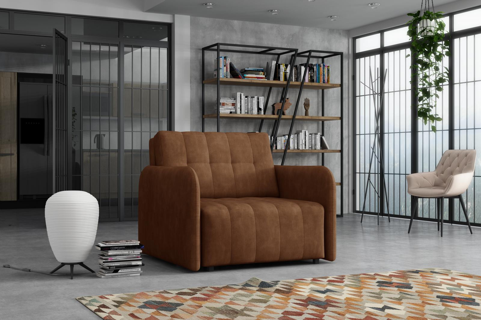 Rozkládací křeslo Vivian je vhodné do dětského, studentského, nebo hostinského pokoje. Jednoduchým rozložením pomocí automatu, získáte lůžko k příležitostnému přespání Vaší návštěvy, nebo kamaráda Vašich dětí. Výplň sedáku tvoří vlnité pružiny v kombinaci s PUR pěnou. Křeslo je potaženo kvalitní látkou s výběrem několika trendy odstínů a velmi elegantním prošíváním. Křeslo disponuje i nepostradatelným úložným prostorem, který využijete např. na deku a polštář. Ostatní vyobrazené doplňky a dekorace nejsou v ceně. Zobrazení barev na fotografii se může od skutečnosti lišit.