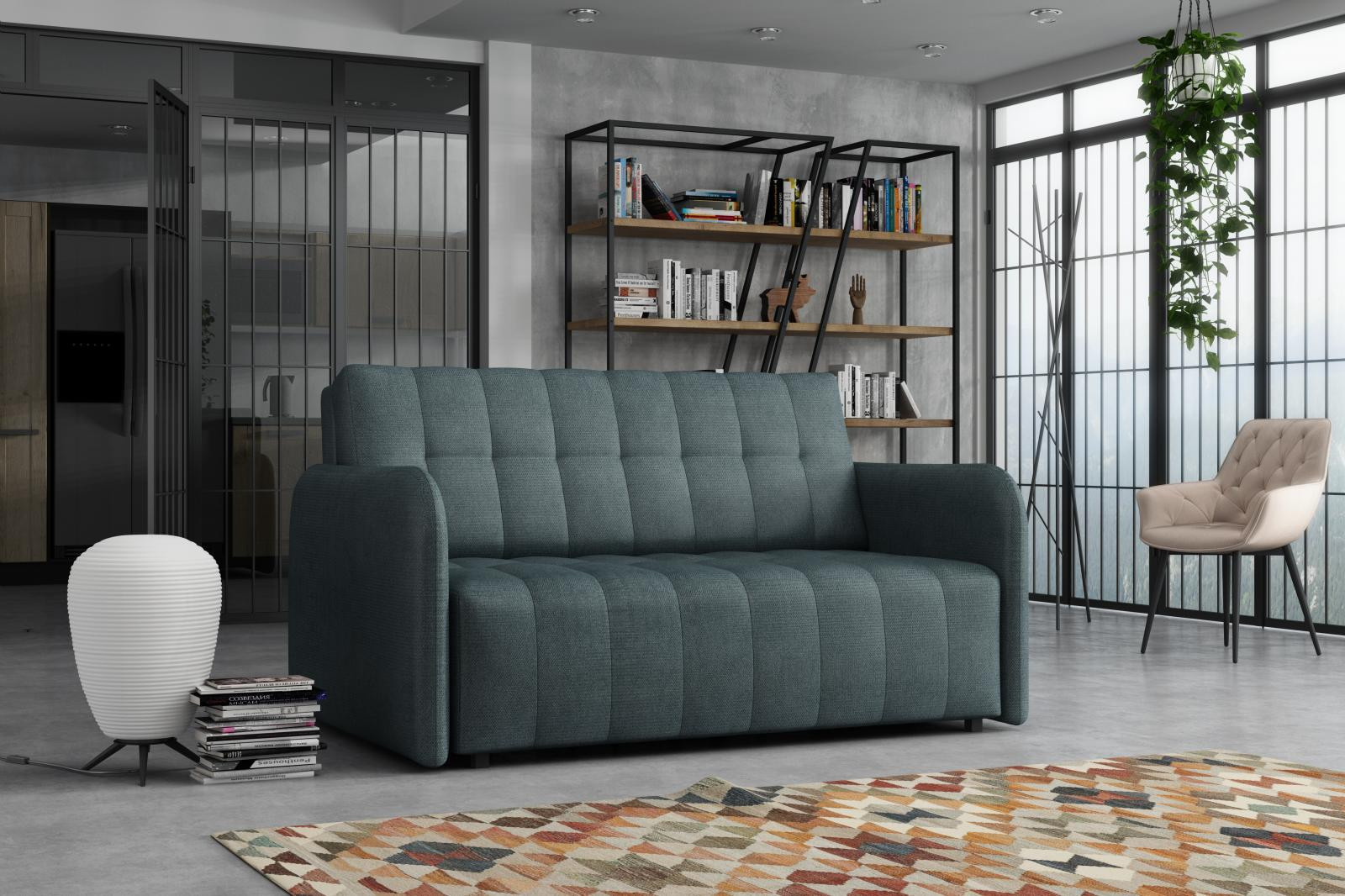 Rozkládací křeslo Vivian je vhodné do dětského, studentského, nebo hostinského pokoje. Jednoduchým rozložením pomocí automatu, získáte lůžko k příležitostnému přespání Vaší návštěvy, nebo kamaráda Vašich dětí. Výplň sedáku tvoří vlnité pružiny v kombinaci s PUR pěnou. Křeslo je potaženo kvalitní látkou s výběrem několika trendy odstínů a velmi elegantním prošíváním. Křeslo disponuje i nepostradatelným úložným prostorem, který využijete např. na deku a polštář. Ostatní vyobrazené doplňky a dekorace nejsou v ceně. Zobrazení barev na fotografii se může od skutečnosti lišit