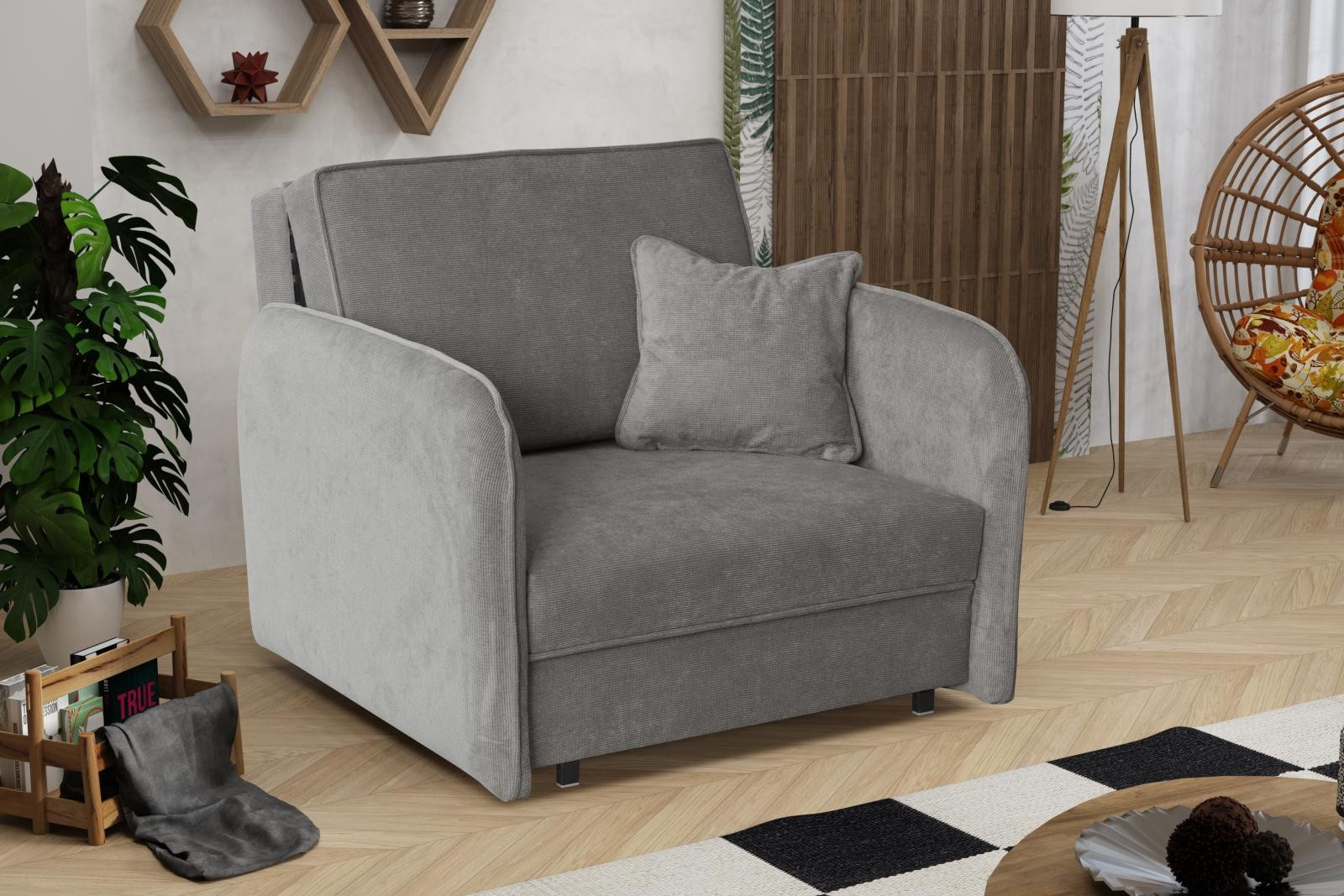 Rozkládací křeslo Vivian je vhodné do dětského, studentského, nebo hostinského pokoje. Jednoduchým rozložením pomocí automatu, získáte lůžko k příležitostnému přespání Vaší návštěvy, nebo kamaráda dětí. Výplň sedáku tvoří vlnité pružiny v kombinaci s PUR pěnou. Křeslo je potaženo kvalitní látkou a nabízíme ho v několika trendy odstínech. Křeslo disponuje i nepostradatelným úložným prostorem, který využijete např. na deku a polštář. V ceně křesla je 1 dekorační polštář. Ostatní vyobrazené doplňky a dekorace nejsou v ceně.