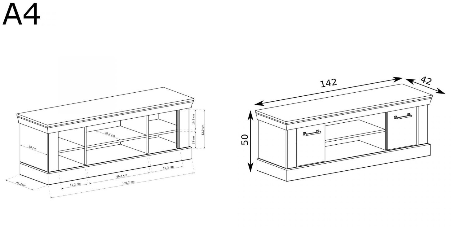 Az Antica kollekció RTV szekrénye, ideális nappaliba vagy hálószobába, bármilyen belső térbe illeszkedik. Van egy nagy polca a szekrény közepén, ideális sok dolog, dísz kiállítására, jól illik a dekóderhez is. A két oldalon szekrény találhatók polcokkal, amelyek úgy osztják fel a teret, hogy az 100%-ban kihasználható legyen. Fém fogantyúk és a szekrények csendes záródása eleganciát és finomságot kölcsönöznek. Kapható két színváltozatban.