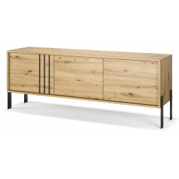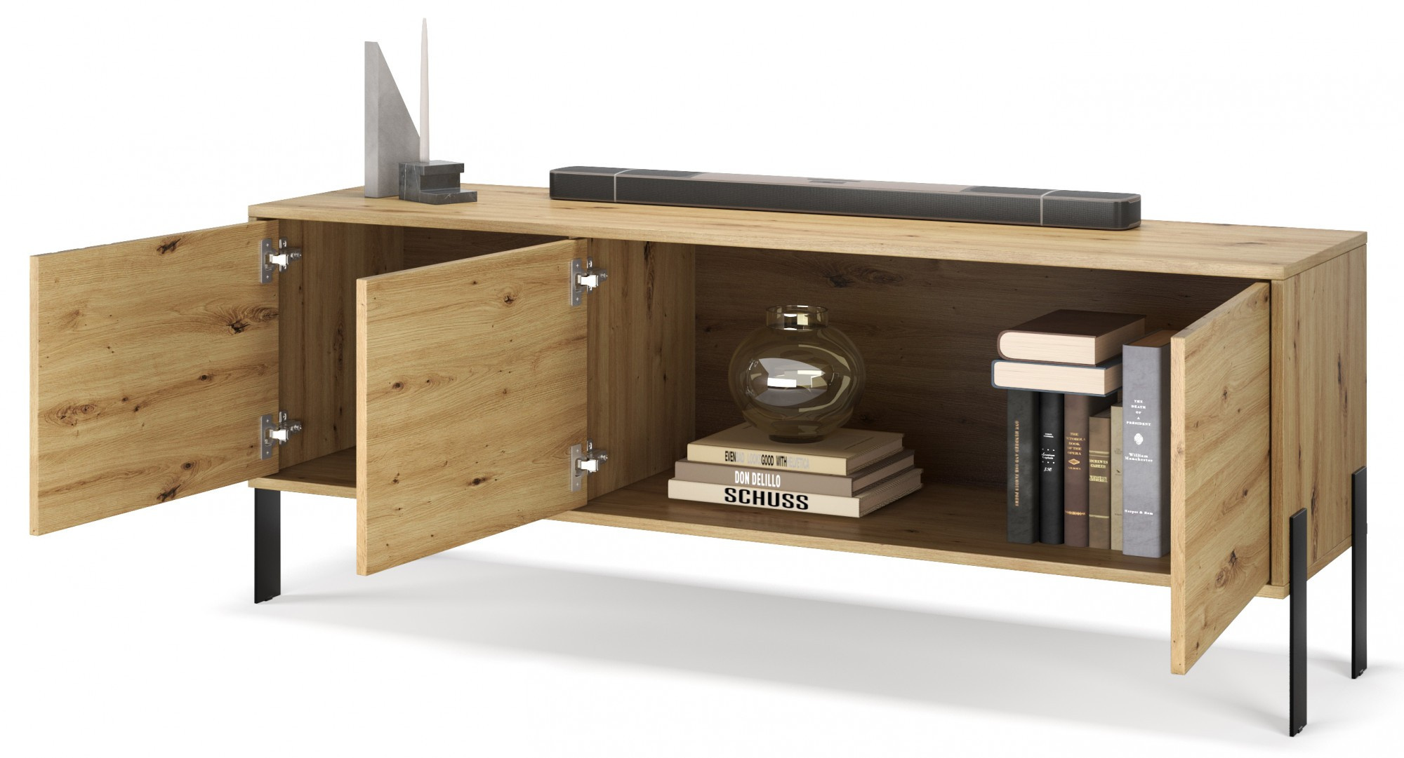 A **Nexo** modern TV szekrény az elegancia, a funkcionalitás és az időtlen design kombinációja. Kiválóan alkalmas a nappaliba, mint stílusos állvány a televízió alá, és praktikus hely a multimédiás eszközök és tartozékok tárolására. A minimalista forma finom dekoratív részletekkel gazdagodott, amelyek különleges jelleget kölcsönöznek a bútornak. Az **Artisan** változatú előlapok kiemelik a fa természetes megjelenését, míg a **Kašmír** változat eleganciát és modern stílust hoz a belső térbe. Az egész szerkezet stabil fém lábakon áll, amelyek könnyedséget kölcsönöznek a konstrukciónak és megkönnyítik a bútor alatti tisztaság fenntartását.