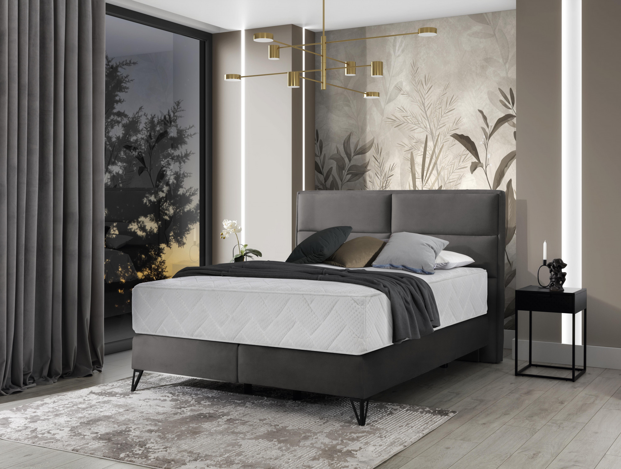 The Safiro continental bed comes with a great quality mattress, not only very comfortable, but also practical. It owes this to the removable zippered cover and the two-sidedness of the mattress. The mattress consists of layers combining latex, T25 foam, coconut and visco foam. There is also a pocket spring inside the mattress. The eye-catching element of the Safiro bed is certainly its designer black legs made of metal. In addition to their decorative function, they also keep the bed stable and give the possibility to drive cleaning robots under the furniture. Another decorative element is the headrest and the stitching that divides the back of the furniture into 4 smaller rectangles. What's more, the Safiro boxspring can be chosen from 3 types of sleeping surfaces: 140x200 cm, 160x200 cm, 180x200 cm.