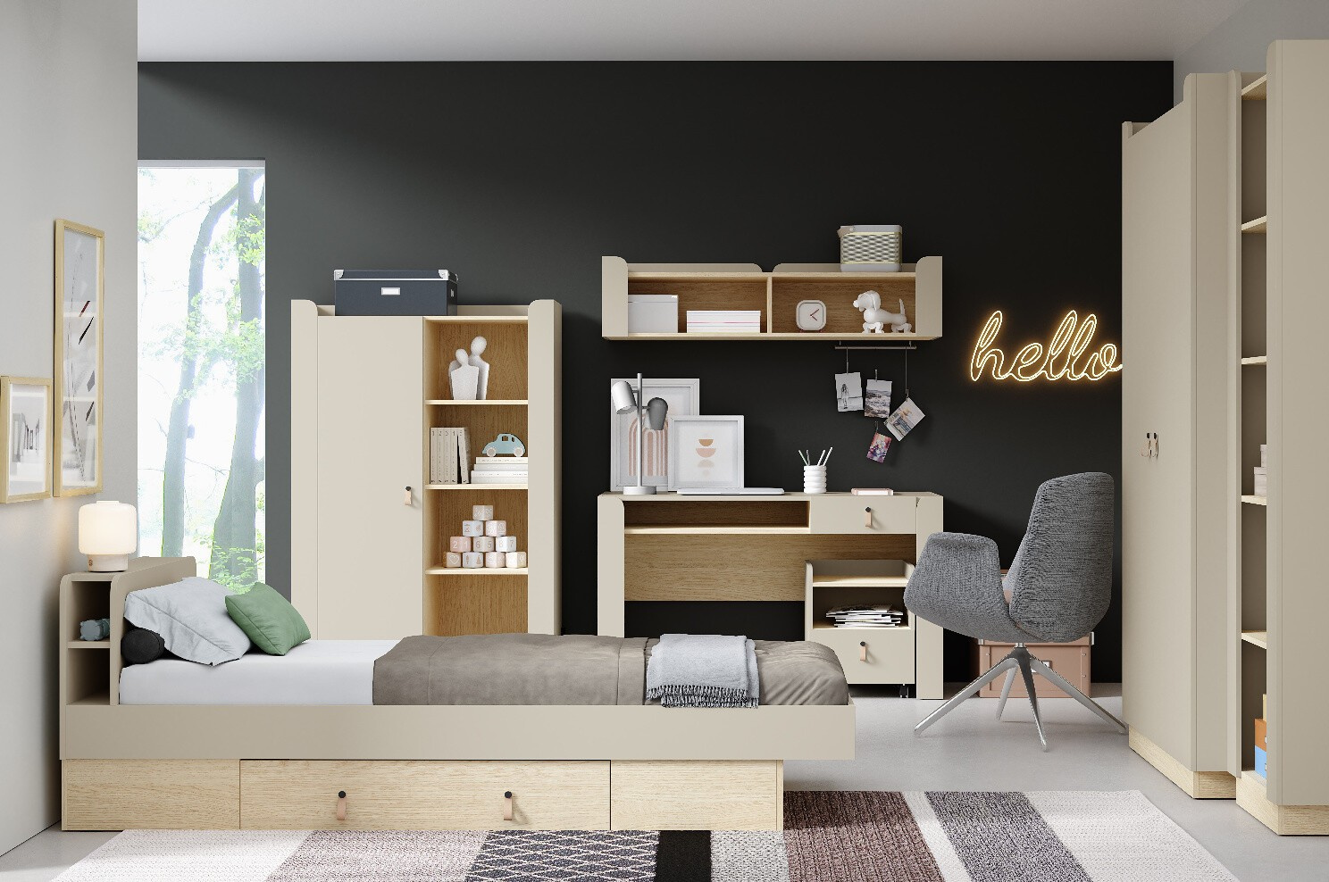A SALERNO moduláris rendszer két színváltozatban érhető el: Macadamia/Mavelie Tölgy és Porcini/Mavelie Tölgy. Ez a rendszer lehetővé teszi a könnyű kombinálást és harmonikus belső tér kialakítását, legyen szó akár gyerekszobáról, nappaliról vagy otthona bármely más helyiségéről.
