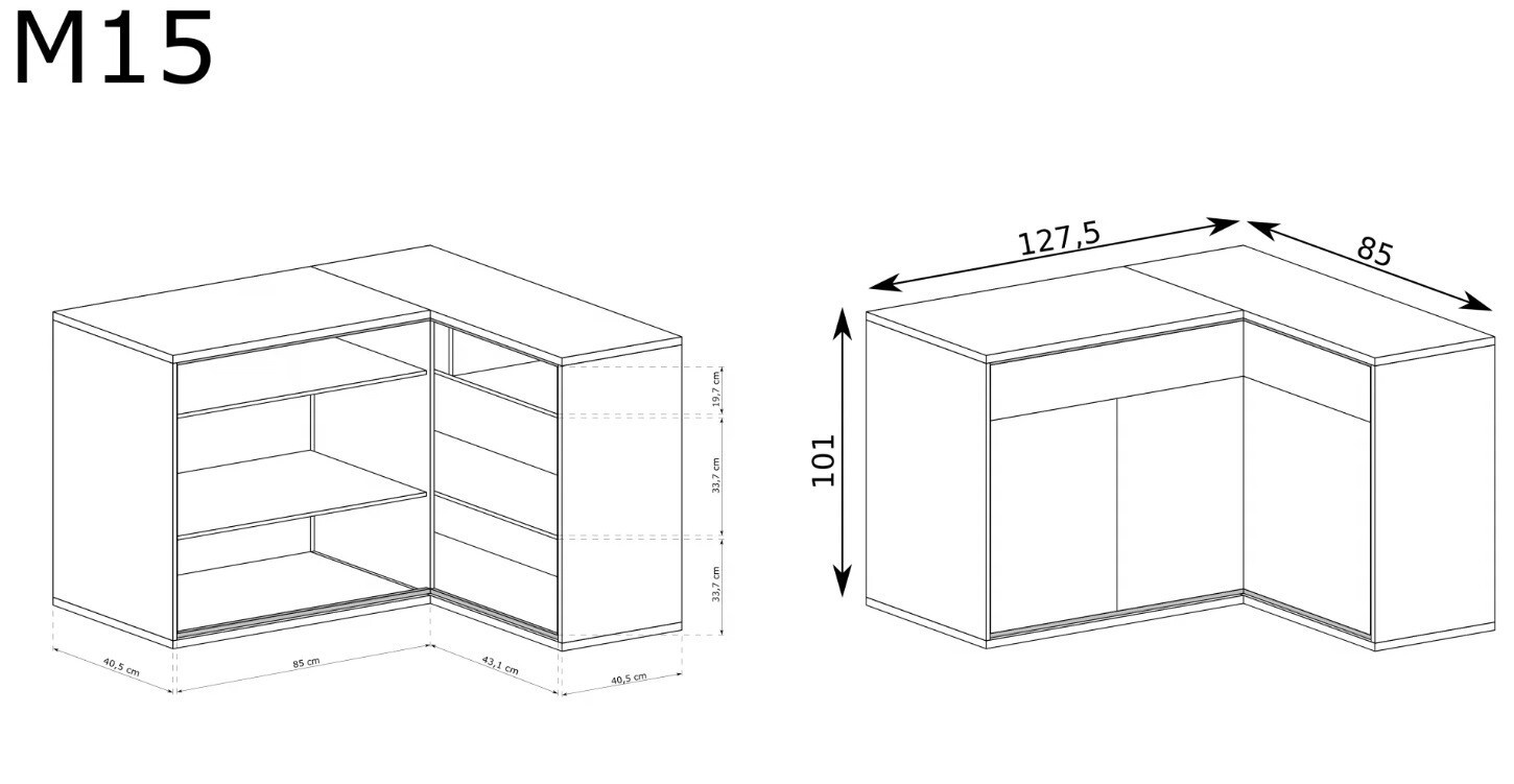 Nagy sarokkomód természetes hikori színben, fekete kiegészítőkkel befejezve. Bútorra van szüksége, amely kitölti a teret? Szeretné kihasználni szobája minden négyzetméterét? Ez a bútor ideális. Tágas ruhásszekrény, amely fiókokkal és polcokkal rendelkezik. A jobb hatás érdekében lehetőség van LED világítással kiegészíteni. Ezenkívül választhat fekete lábakat. A fiók előlapja helyett használhat egy gyönyörű kiegészítőt díszítőlemez formájában. Elérhető a termék fordított változata is. Két fiók és három szekrény nagyszerű helyet biztosít a dolgaid rendezéséhez. A komód nagy és kis helyiségekbe egyaránt alkalmas. Alkalmas nappaliba, szobába és étkezőbe is.