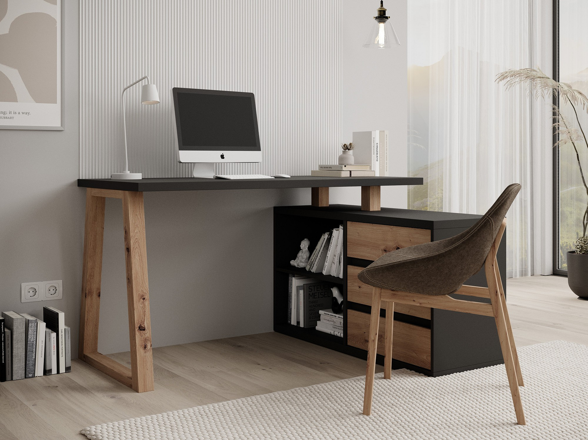 Az IWO II sarokasztal ideális választás diákok szobájába, irodába vagy dolgozószobába. Sarokkialakításának köszönhetően kis helyiségekbe is befér. A bútor három fiókkal és egy tágas polccal van felszerelve, ami elegendő helyet biztosít az irodai kellékek tárolására. Az IWO II íróasztal praktikus és sokoldalú bútordarab, amely biztosan illeszkedik a legtöbb belső térbe.