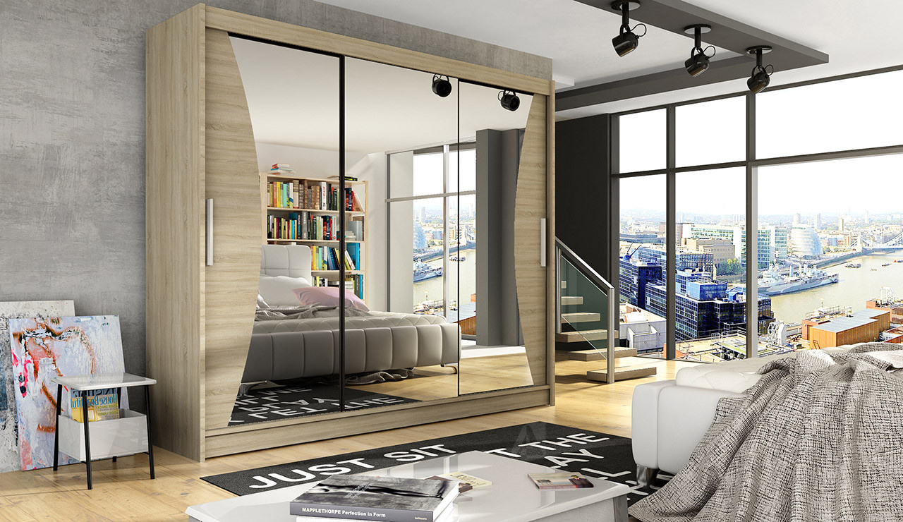 Skříň Astana s posuvnými dveřmi, je vyrobena z kvalitního lamina o síle 16 mm a hrany jsou ukončeny ABS lištou. Vodící lišty jsou vyrobeny z odolného hliníku a splňují požadavky pro každodenní užívání. Na dveřích skříně jsou nalepená zrcadla, která jsou na obou stranách zaříznutá do elegantního oblouku. Zrcadla místnost opticky zvětší a prosvětlí. Skříň nabízíme ve čtyřech odstínech. Díky svým rozměrům a uspořádání poskytuje dostatek úložného prostoru. Skříň je dodávána v demontu a součástí je montážní plánek včetně všech potřebných spojovacích materiálů. Vyobrazené dekorace nejsou v ceně.