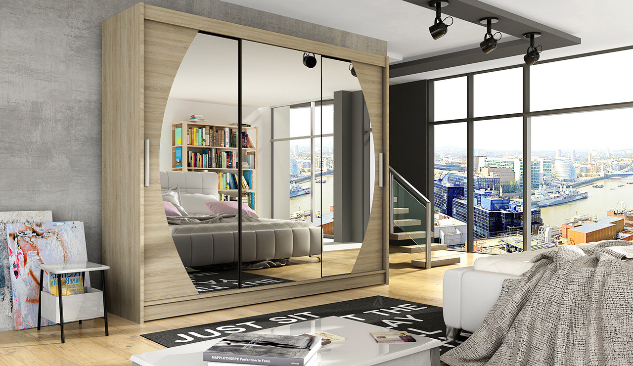 Skříň Astana s posuvnými dveřmi, je vyrobena z kvalitního lamina o síle 16 mm a hrany jsou ukončeny ABS lištou. Vodící lišty jsou vyrobeny z odolného hliníku a splňují požadavky pro každodenní užívání. Na dveřích jsou nalepená skleněná zrcadla, která jsou na obou stranách zaříznutá do elegantního oblouku a jsou součástí skříně. Zrcadla místnost opticky zvětší a prosvětlí. Skříň nabízíme ve čtyřech odstínech. Díky svým rozměrům a uspořádání poskytuje dostatek úložného prostoru. Skříň je dodávána v demontu a součástí je montážní plánek včetně všech potřebných spojovacích materiálů. Vyobrazené dekorace nejsou v ceně.