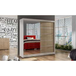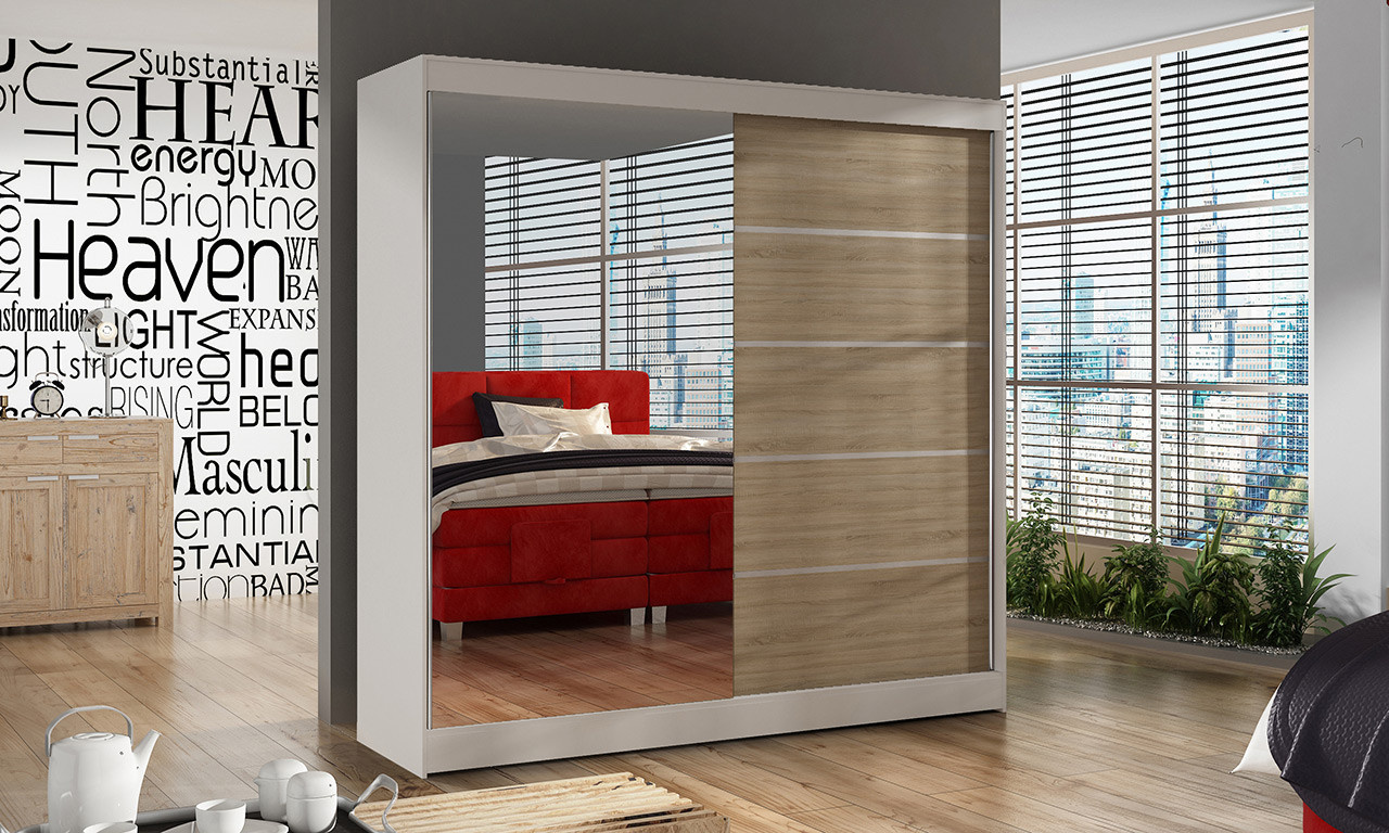 Skříň je vyrobena z kvalitního lamina. Díky svému vnitřnímu uspořádání nabízí dostatek úložného prostoru, posuvné dveře šetří prostor a zrcadlo ho opticky zvětšuje. Skříň je vhodná do ložnice, dětského nebo studentského pokoje, do předsíně i kanceláře. Vnitřní uspořádání skříně je vyobrazeno na fotografii. Skříň je dodávána v demontu. Součástí je i skleněné zrcadlo, které je nalepeno na jedné části dveří skříně a také montážní plánek včetně všech potřebných spojovacích materiálů. Vyobrazené dekorace nejsou v ceně.