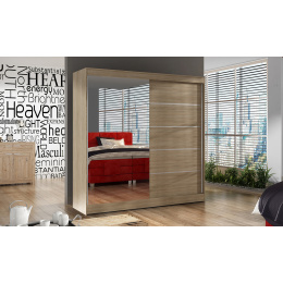 Skříň je vyrobena z kvalitního lamina. Díky svému vnitřnímu uspořádání nabízí dostatek úložného prostoru, posuvné dveře šetří prostor a zrcadlo ho opticky zvětšuje. Skříň je vhodná do ložnice, dětského nebo studentského pokoje, do předsíně i kanceláře. Vnitřní uspořádání skříně je vyobrazeno na fotografii. Skříň je dodávána v demontu. Součástí je i skleněné zrcadlo, které je nalepeno na jedné části dveří skříně a také montážní plánek včetně všech potřebných spojovacích materiálů. Vyobrazené dekorace nejsou v ceně.