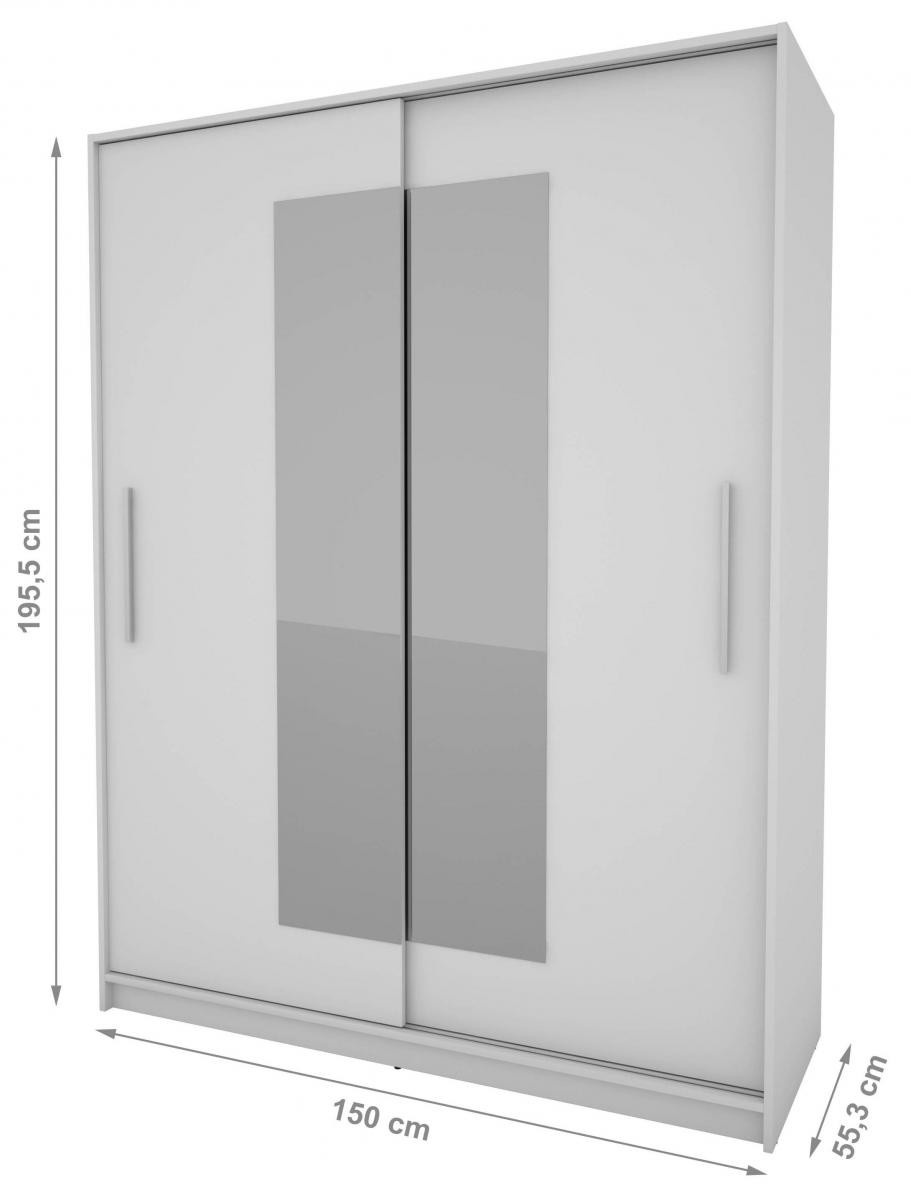 Skříň je vyrobena z kvalitního lamina. Díky svému vnitřnímu uspořádání nabízí dostatek úložného prostoru, posuvné dveře šetří prostor a zrcadlo ho opticky zvětšuje. Skříň je vhodná do ložnice, dětského nebo studentského pokoje, do předsíně i kanceláře. Vnitřní uspořádání skříně je vyobrazeno na fotografii. Skříň je dodávána v demontu. Součástí jsou i skleněná zrcadla, která jsou nalepena na dveřích skříně a také montážní plánek včetně všech potřebných spojovacích materiálů. Vyobrazené dekorace nejsou v ceně.