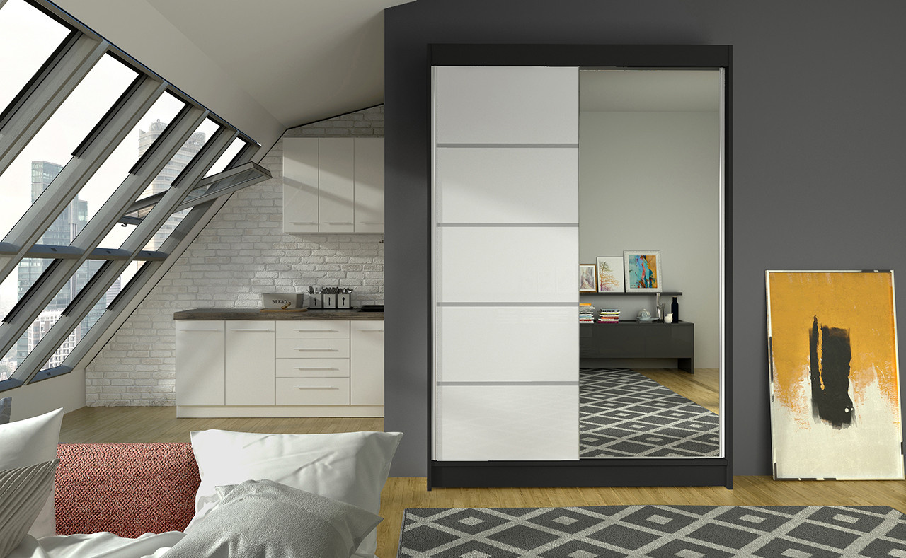 Skříň je vyrobena z kvalitního lamina. Díky svému vnitřnímu uspořádání nabízí dostatek úložného prostoru, posuvné dveře šetří prostor a zrcadlo ho opticky zvětšuje. Skříň je vhodná do ložnice, dětského nebo studentského pokoje, do předsíně i kanceláře. Vnitřní uspořádání skříně je vyobrazeno na fotografii. Skříň je dodávána v demontu. Součástí jsou i skleněná zrcadla, která jsou nalepena na dveřích skříně a také montážní plánek včetně všech potřebných spojovacích materiálů. Vyobrazené dekorace nejsou v ceně.