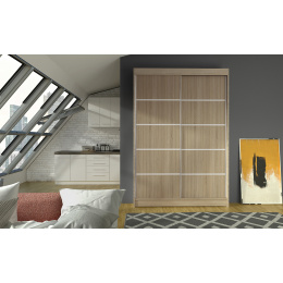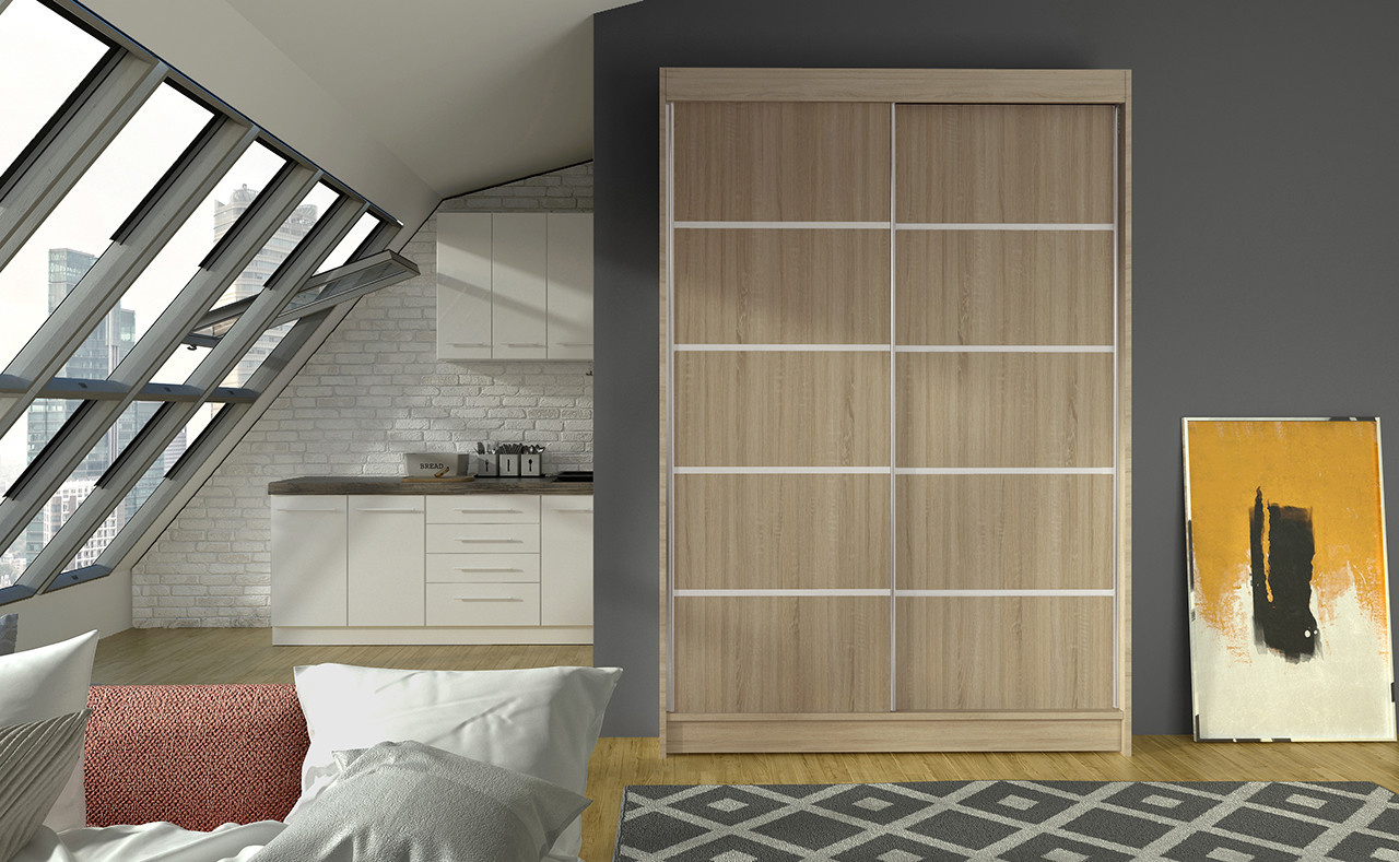 Skříň je vyrobena z kvalitního lamina. Díky svému vnitřnímu uspořádání nabízí dostatek úložného prostoru a posuvné dveře prostor šetří. Skříň je vhodná do ložnice, dětského nebo studentského pokoje, do předsíně i kanceláře. Vnitřní uspořádání skříně je vyobrazeno na fotografii. Skříň je dodávána v demontu a součástí je montážní plánek včetně všech potřebných spojovacích materiálů. Vyobrazené dekorace nejsou v ceně.
