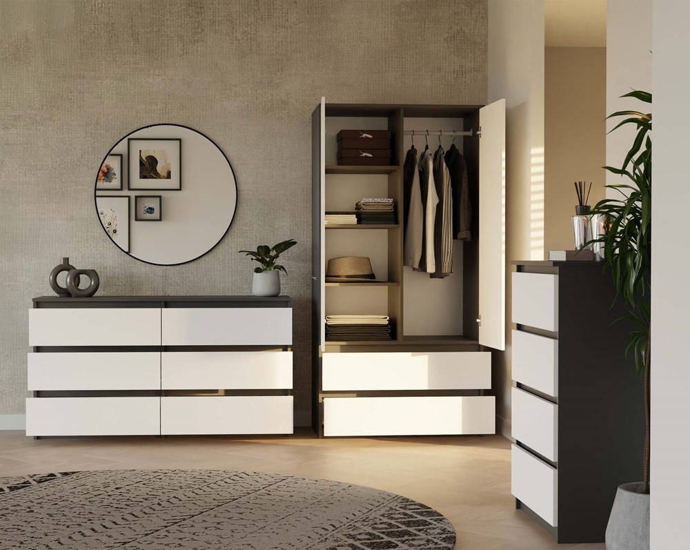 Šatní skříň Malvína v trendy barvách a moderním designu je praktický kus nábytku, který najde své uplatnění v ložnici, dětském pokoji, ale také v kanceláři nebo domácí pracovně. Nabízí dostatek úložného prostoru s možností instalace polic nebo šatní tyče v závislosti na vašich požadavcích. Dvířka se systémem TIP-ON se otevírají po jemném zatlačení čela dvířek. Nábytek je vyroben z nejkvalitnější laminované desky odolné proti poškrábání a vlhkosti, hrany jsou zakončené ABS materiálem.