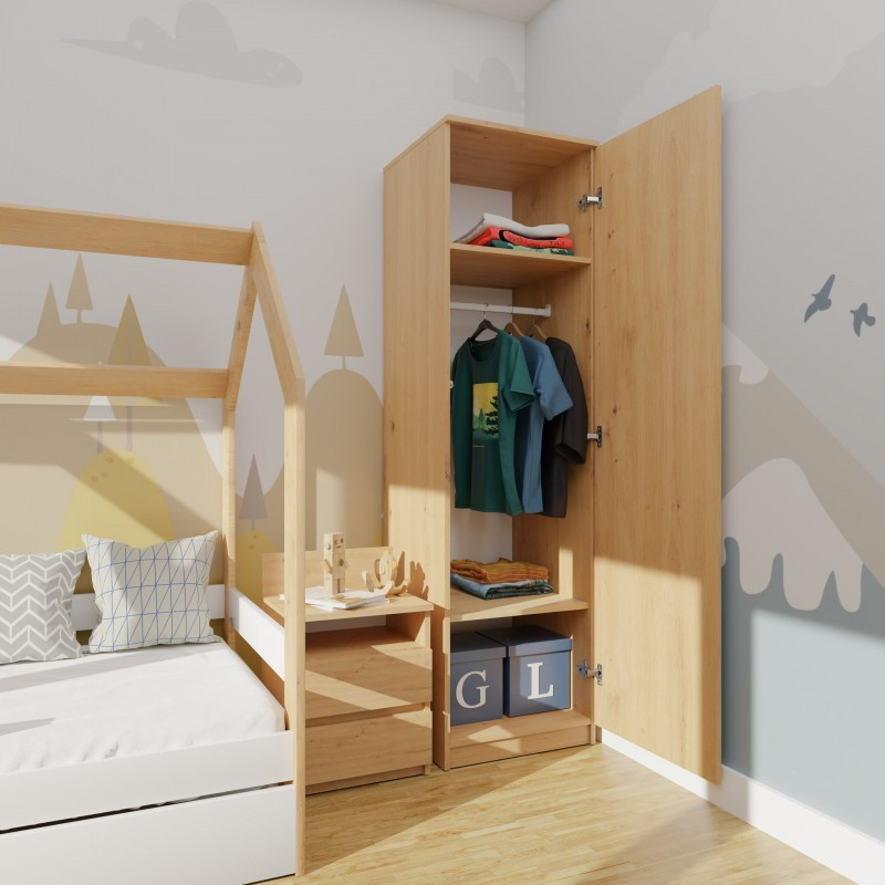 Šatní skříň Malvína v trendy barvách a moderním designu je praktický kus nábytku, který najde své uplatnění v ložnici, dětském pokoji, ale také v kanceláři nebo domácí pracovně. Nabízí dostatek úložného prostoru s možností instalace polic nebo šatní tyče v závislosti na vašich požadavcích. Dvířka se systémem TIP-ON se otevírají po jemném zatlačení čela dvířek. Nábytek je vyroben z nejkvalitnější laminované desky odolné proti poškrábání a vlhkosti, hrany jsou zakončené ABS materiálem.