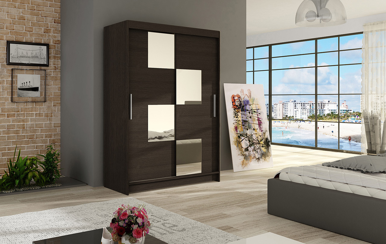 Moderní a elegantní design skříně osloví i náročné zákazníky. Eleganci podtrhují dlouhé stříbrné úchyty a moderní nádech dodávají zrcadla, která jsou nalepena na dveřích skříně. Je vyrobena z lamina o síle 16 mm a hrany jsou ukončeny ABS lištou. Vodící lišty jsou vyrobeny z odolného hliníku a splňují požadavky pro každodenní užívání. Díky svému uspořádání poskytuje dostatek úložného prostoru. Skvěle se hodí do ložnice, předsíně, dětského, nebo studentského pokoje. Skříň je dodávána v demontu a součástí je montážní plánek včetně všech potřebných spojovacích materiálů. Vyobrazené dekorace nejsou v ceně.