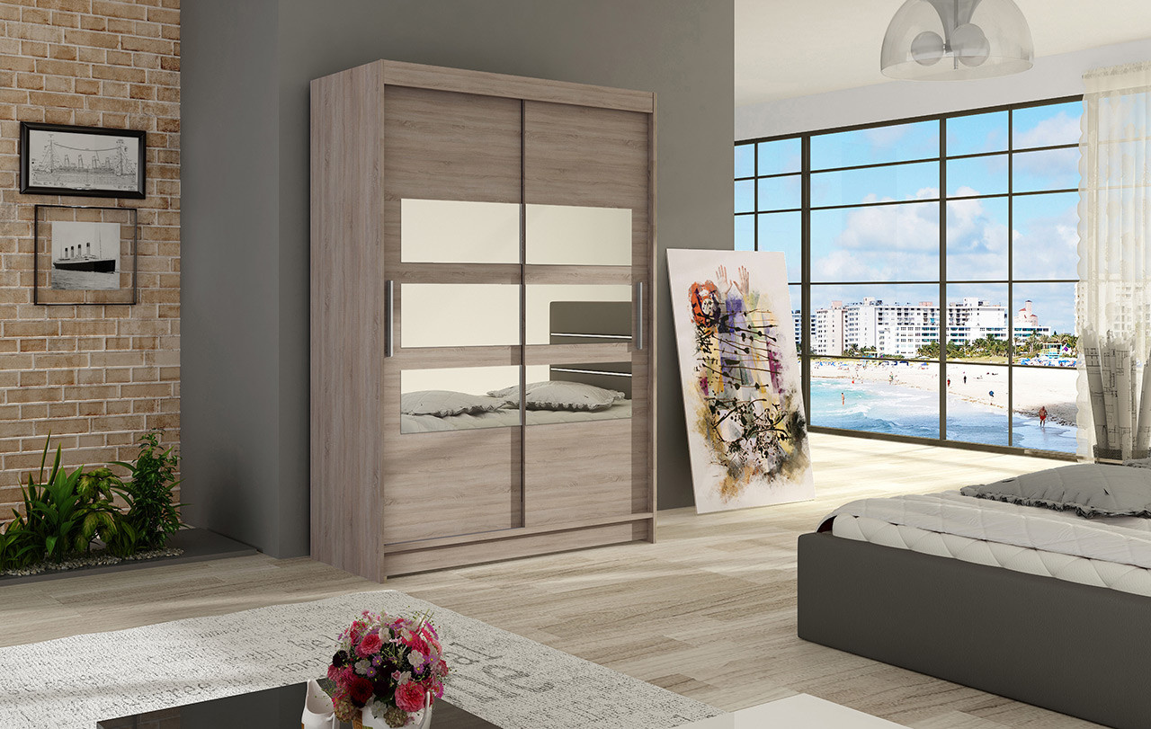 Moderní a elegantní design skříně osloví i náročné zákazníky. Eleganci podtrhují dlouhé stříbrné úchyty a moderní nádech dodávají zrcadla, která jsou nalepena na dveřích skříně. Je vyrobena z lamina o síle 16 mm a hrany jsou ukončeny ABS lištou. Vodící lišty jsou vyrobeny z odolného hliníku a splňují požadavky pro každodenní užívání. Díky svému uspořádání poskytuje dostatek úložného prostoru. Skvěle se hodí do ložnice, předsíně, dětského, nebo studentského pokoje. Skříň je dodávána v demontu a součástí je montážní plánek včetně všech potřebných spojovacích materiálů. Vyobrazené dekorace nejsou v ceně.