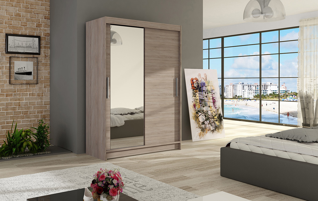 Moderní a elegantní design skříně osloví i náročné zákazníky. Eleganci podtrhují dlouhé stříbrné úchyty a zrcadla na dveřích skříně. Je vyrobena z lamina o síle 16 mm a hrany jsou ukončeny ABS lištou. Vodící lišty jsou vyrobeny z odolného hliníku a splňují požadavky pro každodenní užívání. Díky svému uspořádání poskytuje dostatek úložného prostoru. Skvěle se hodí do ložnice, předsíně, dětského, nebo studentského pokoje. Skříň je dodávána v demontu a součástí je montážní plánek včetně všech potřebných spojovacích materiálů. Vyobrazené dekorace nejsou v ceně. Součástí je i skleněné zrcadlo, které je nalepeno na jedné části dveří skříně.