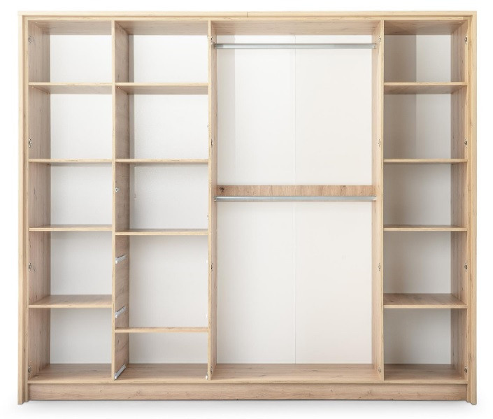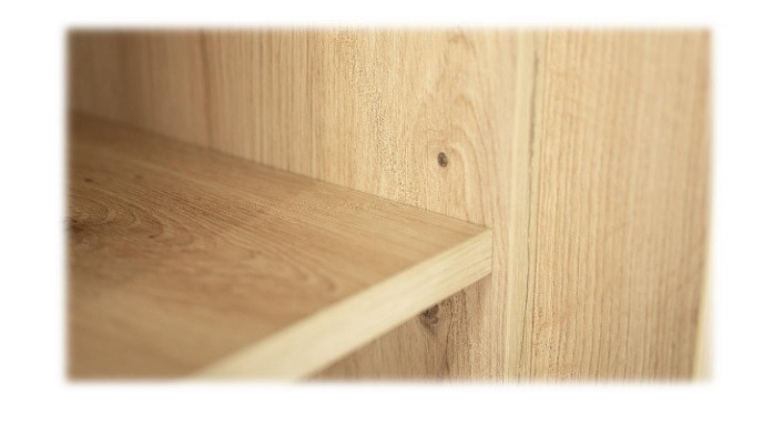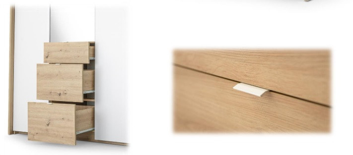 Šatní skříň NICEA s dveřmi v moderním provedení. Korpus i dvířka jsou z kvalitního LTD v barvě dub artisan a bílá. Skříň má šatní tyče a police. Uspořádání polic viz. obrázek. Dodáváme v demontovaném stavu.