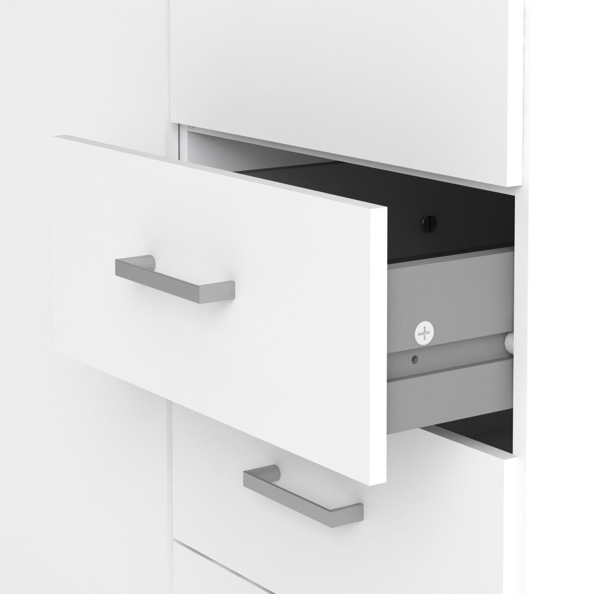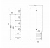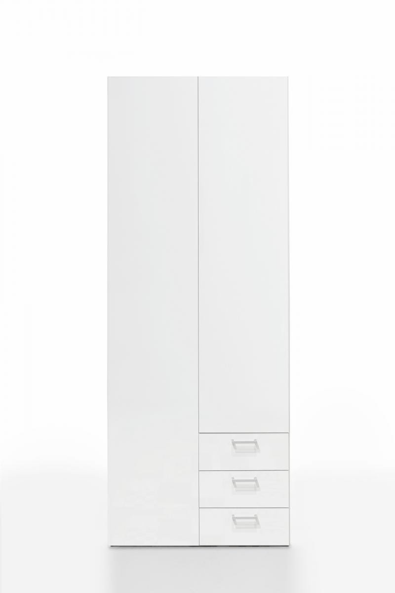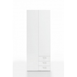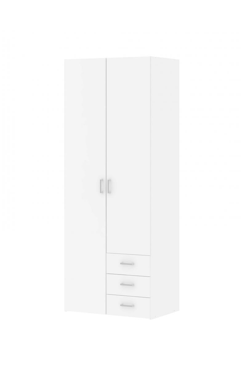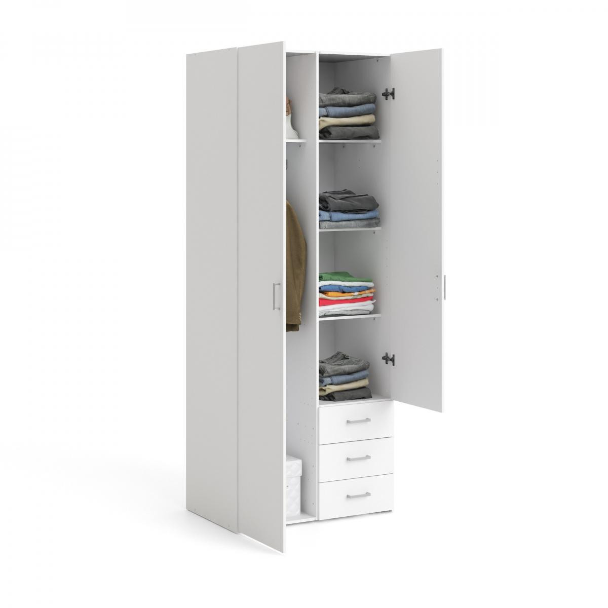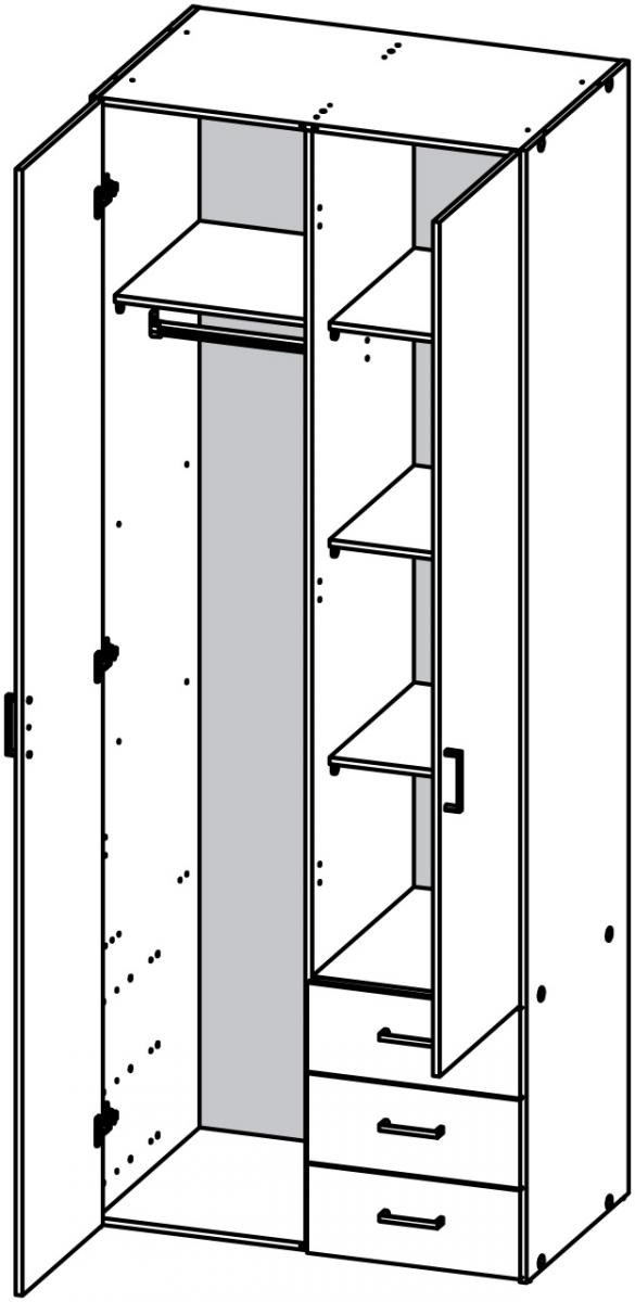 Praktická a moderní šatní skříň dánského výrobce Tvilum. Šatní skříň má část policovou se třemi policemi, 3 zásuvky a část šatní s jednou policí a šatní tyčí (viz nákres s doporučeným zatížením). Skříň je vyrobena z lamina o tloušťce 12 mm a má plastové úchytky. U tohoto typu mohou být některé nepohledové hrany desek nebo plochy neopáskovány v barvě skříně (především vrchní půda či hrany dveří, apod.).