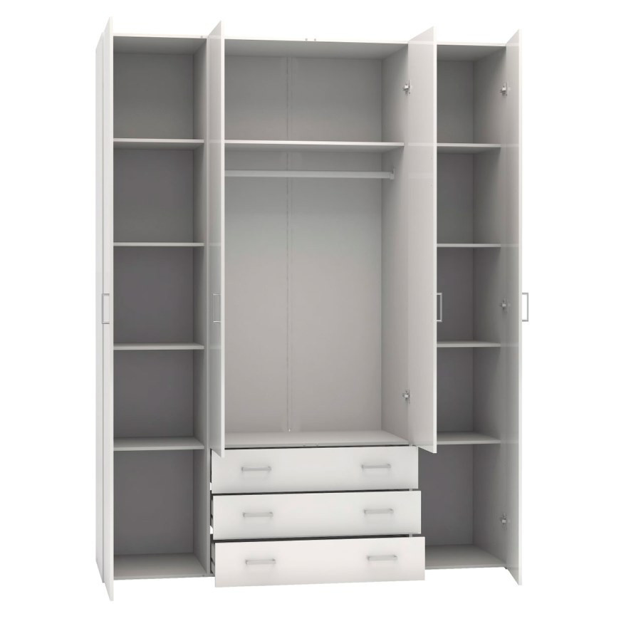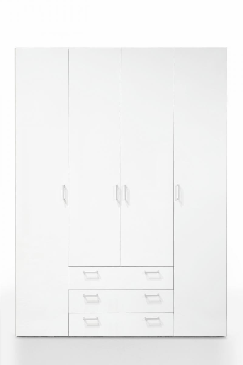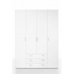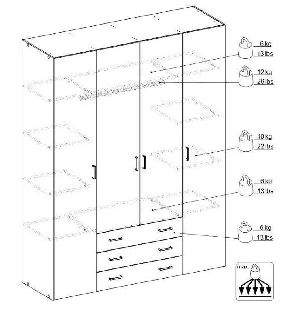 Praktická a moderní šatní skříň dánského výrobce Tvilum. Šatní skříň má dvě části policové se čtyřmi policemi v každé, 3 zásuvky a část šatní s jednou policí a šatní tyčí (viz nákres s doporučeným zatížením). Skříň je vyrobena z lamina o tloušťce 12 mm a má plastové úchytky. U tohoto typu mohou být některé nepohledové hrany desek nebo plochy neopáskovány v barvě skříně (především vrchní půda či hrany dveří, apod.).