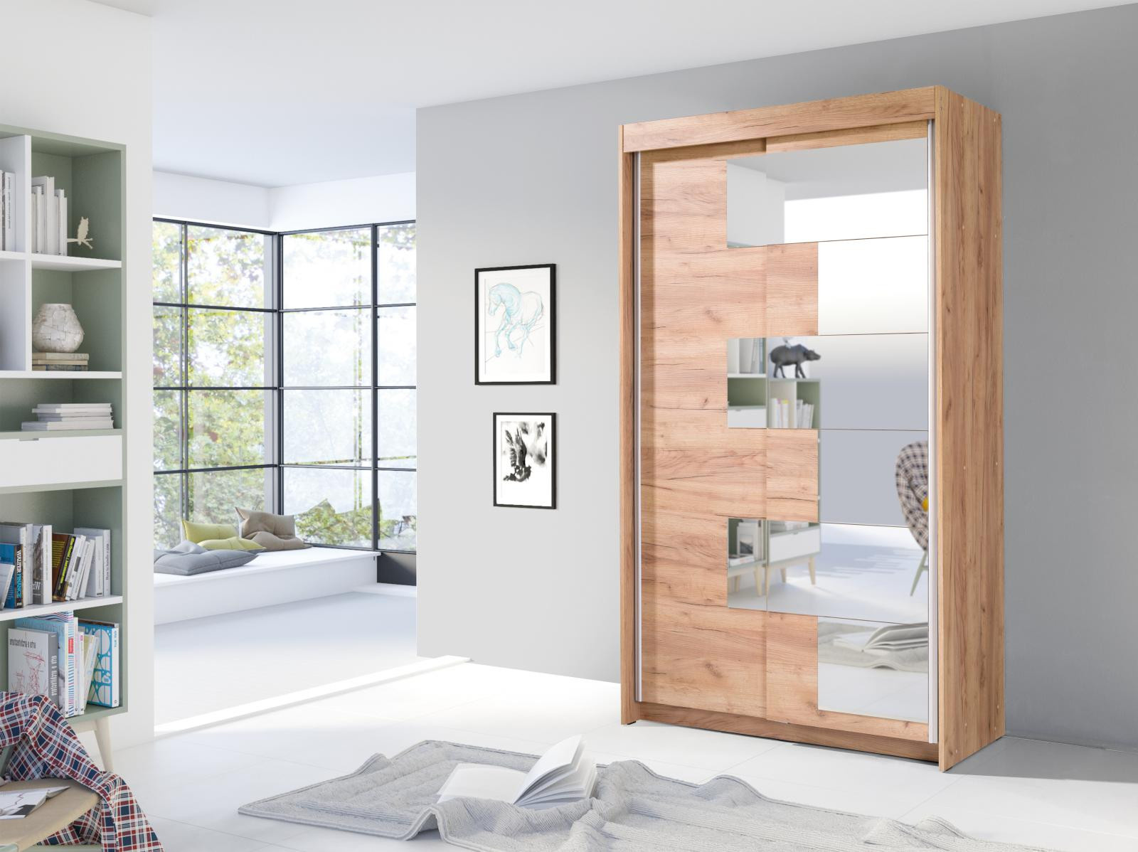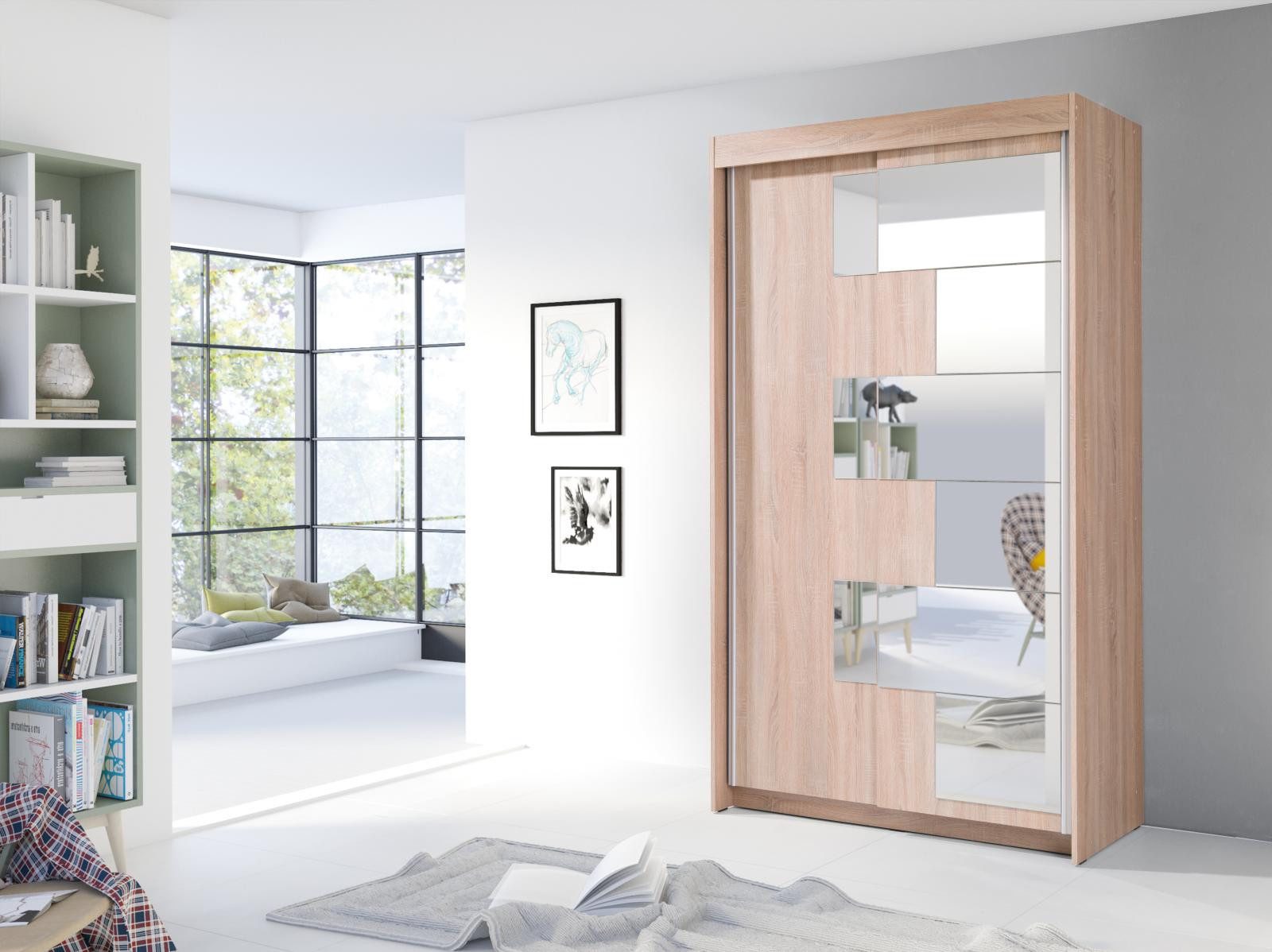 Šatní skříň s posuvnými dveřmi Szarlota, je vyrobena z kvalitního lamina. Díky svému vnitřnímu uspořádání nabízí dostatek úložného prostoru, posuvné dveře šetří prostor a zrcadlo s netradičním osazením, ho opticky zvětšuje. Skříň je vhodná do ložnice, dětského nebo studentského pokoje, do předsíně i kanceláře. Vnitřní uspořádání skříně je vyobrazeno na fotografii. Skříň je dodávána v demontu a součástí je montážní plánek včetně všech potřebných spojovacích materiálů. Vyobrazené dekorace nejsou v ceně. Skříň nabízíme v dekoru bílá, dub sonoma a dub zlatý.