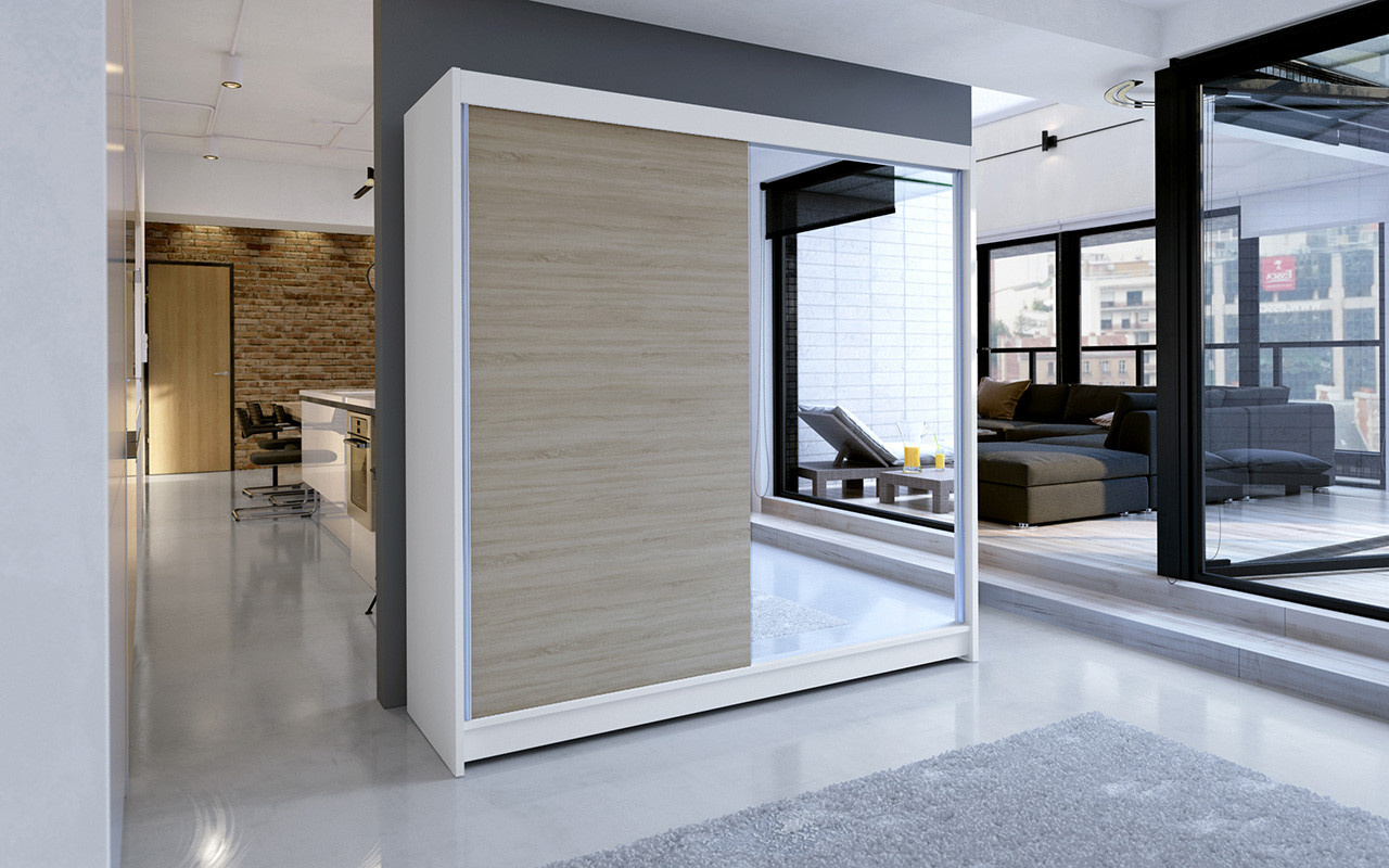 Skříň je vyrobena z kvalitního lamina. Díky svému vnitřnímu uspořádání nabízí dostatek úložného prostoru, posuvné dveře šetří prostor a zrcadlo ho opticky zvětšuje. Skříň je vhodná do ložnice, dětského nebo studentského pokoje, do předsíně i kanceláře. Vnitřní uspořádání skříně je vyobrazeno na fotografii. Skříň je dodávána v demontu. Součástí je i skleněné zrcadlo, které je nalepeno na jedné části dveří skříně a také montážní plánek včetně všech potřebných spojovacích materiálů. Vyobrazené dekorace nejsou v ceně.