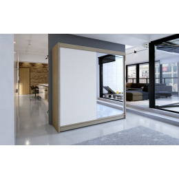 Skříň je vyrobena z kvalitního lamina. Díky svému vnitřnímu uspořádání nabízí dostatek úložného prostoru, posuvné dveře šetří prostor a zrcadlo ho opticky zvětšuje. Skříň je vhodná do ložnice, dětského nebo studentského pokoje, do předsíně i kanceláře. Vnitřní uspořádání skříně je vyobrazeno na fotografii. Skříň je dodávána v demontu. Součástí je i skleněné zrcadlo, které je nalepeno na jedné části dveří skříně a také montážní plánek včetně všech potřebných spojovacích materiálů. Vyobrazené dekorace nejsou v ceně.