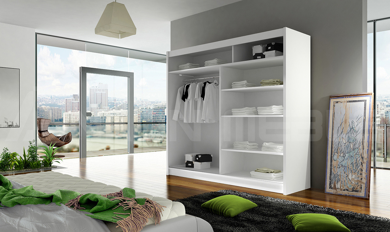 Skříň je vyrobena z kvalitního lamina. Díky svému vnitřnímu uspořádání nabízí dostatek úložného prostoru, posuvné dveře šetří prostor a zrcadlo ho opticky zvětšuje. Skříň je vhodná do ložnice, dětského nebo studentského pokoje, do předsíně i kanceláře. Vnitřní uspořádání skříně je vyobrazeno na fotografii. Skříň je dodávána v demontu. Součástí jsou i skleněná zrcadla, která jsou nalepena na dveřích skříně a také montážní plánek včetně všech potřebných spojovacích materiálů. Vyobrazené dekorace nejsou v ceně.