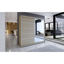 Skříň je vyrobena z kvalitního lamina. Díky svému vnitřnímu uspořádání nabízí dostatek úložného prostoru, posuvné dveře šetří prostor a zrcadlo ho opticky zvětšuje. Skříň je vhodná do ložnice, dětského nebo studentského pokoje, do předsíně i kanceláře. Vnitřní uspořádání skříně je vyobrazeno na fotografii. Skříň je dodávána v demontu. Součástí je i skleněné zrcadlo, které je nalepeno na jedné části dveří skříně a také montážní plánek včetně všech potřebných spojovacích materiálů. Vyobrazené dekorace nejsou v ceně.