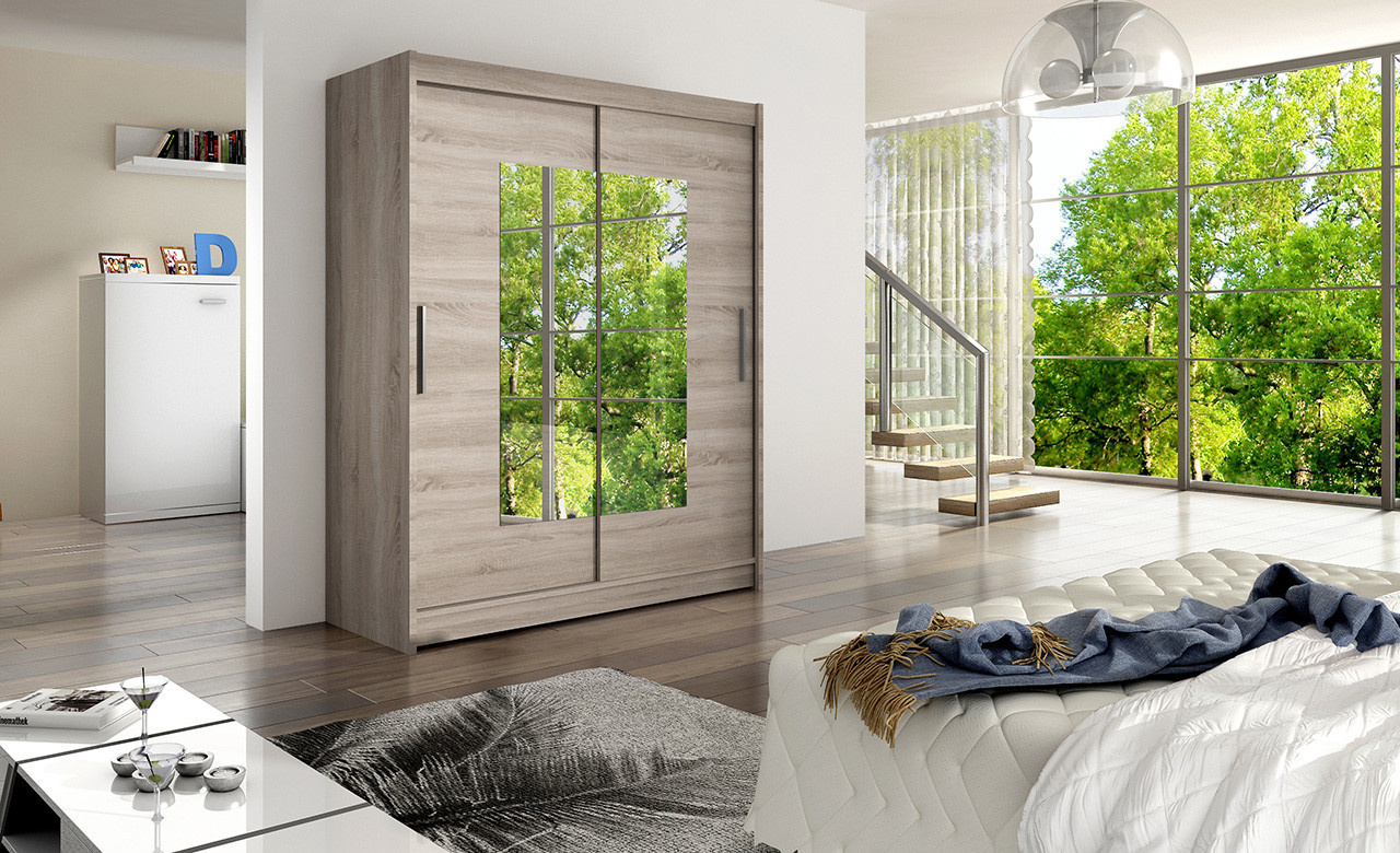 Jednoduchý a elegantní design skříně osloví i náročné zákazníky. Eleganci podtrhují dlouhé stříbrné úchyty a zrcadla, která jsou nalepena na dveřích skříně. Je vyrobena z lamina o síle 16 mm a hrany jsou ukončeny ABS lištou. Vodící lišty jsou vyrobeny z odolného hliníku a splňují požadavky pro každodenní užívání. Díky svému uspořádání poskytuje dostatek úložného prostoru. Skvěle se hodí do ložnice, předsíně, dětského, nebo studentského pokoje. Skříň je dodávána v demontu a součástí je montážní plánek včetně všech potřebných spojovacích materiálů. Vyobrazené dekorace nejsou v ceně.