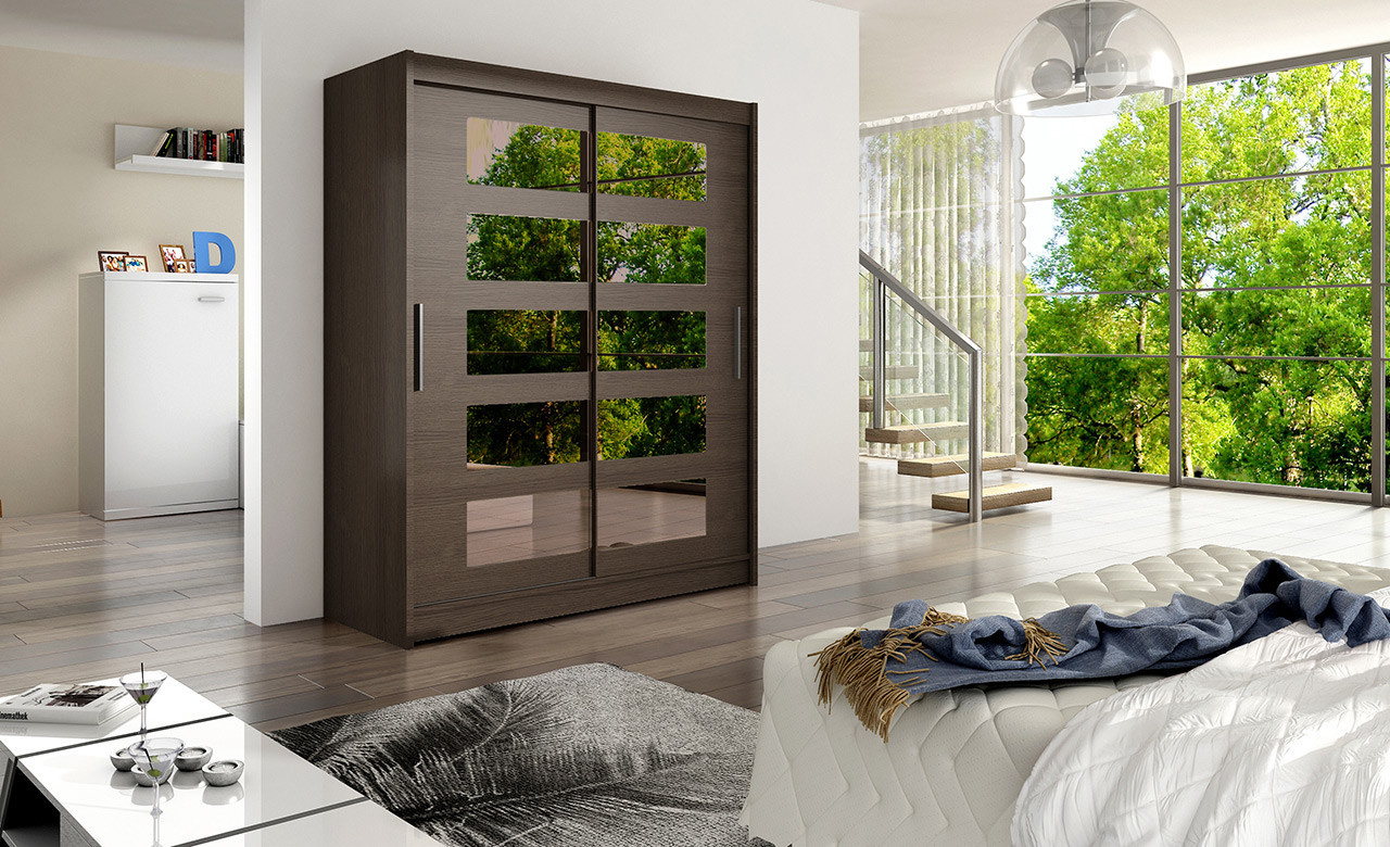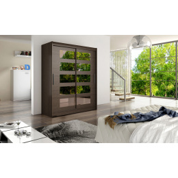 Jednoduchý a elegantní design skříně osloví i náročné zákazníky. Eleganci podtrhují dlouhé stříbrné úchyty a kouřová zrcadla, která jsou nalepena na dveřích skříně. Je vyrobena z lamina o síle 16 mm a hrany jsou ukončeny ABS lištou. Vodící lišty jsou vyrobeny z odolného hliníku a splňují požadavky pro každodenní užívání. Díky svému uspořádání poskytuje dostatek úložného prostoru. Skvěle se hodí do ložnice, předsíně, dětského, nebo studentského pokoje. Skříň je dodávána v demontu a součástí je montážní plánek včetně všech potřebných spojovacích materiálů. Vyobrazené dekorace nejsou v ceně.